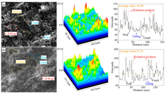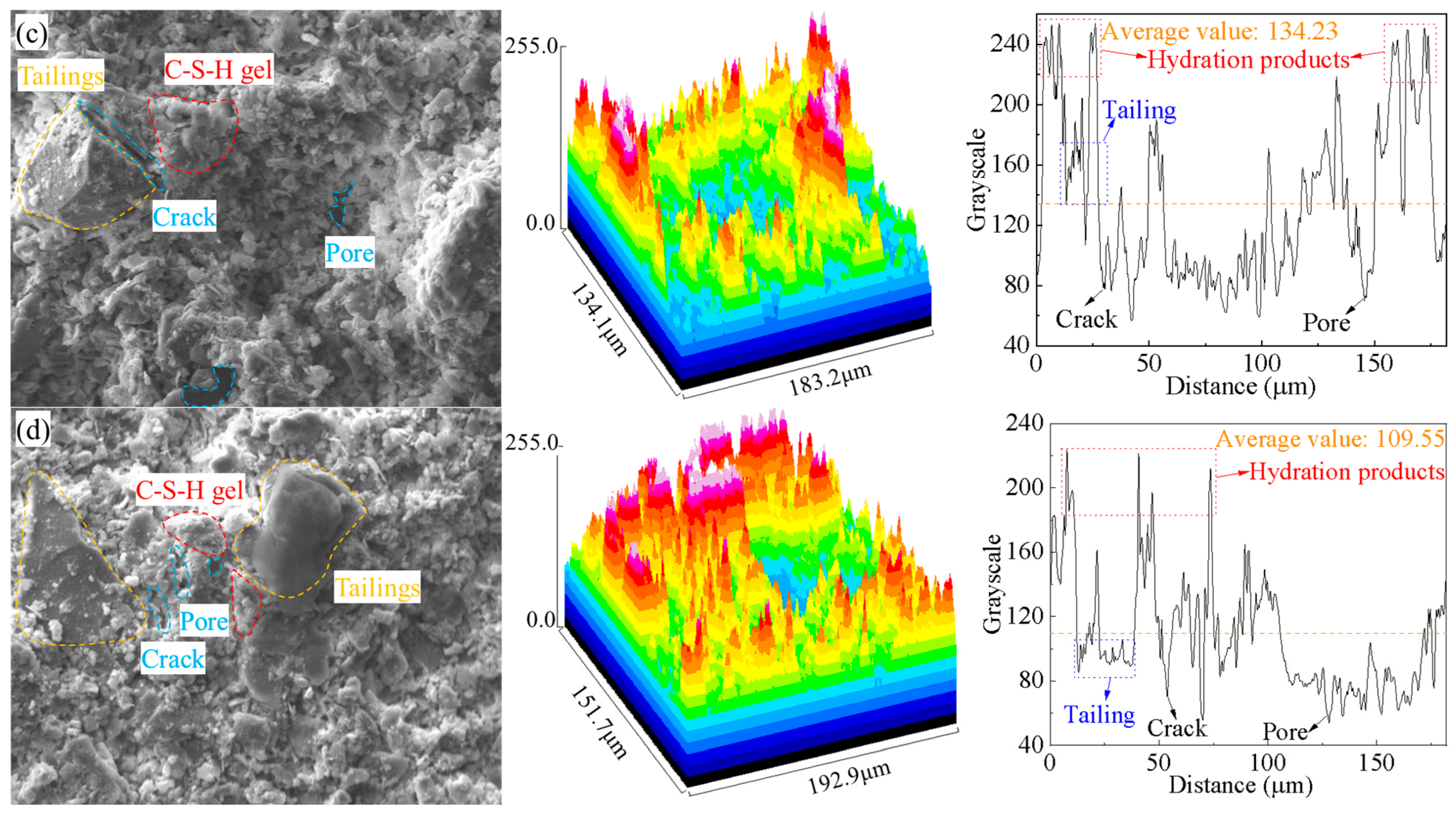 The microstructure of CPBs under different curing temperatures is shown in Figure 10. This image includes SEM images, 3D pseudo-color enhancement map, 2D grayscale profile lines, and macro and micro parameters of CPBs obtained from previous analysis. To enhance the contrast and quantitative perception of surface topography and pore distribution in the SEM images, 3D pseudo-color maps were generated using ImageJ (v1.52p) software. The process involved: (1) importing the original 8-bit grayscale SEM image; (2) applying a consistent noise reduction filter (e.g., Gaussian blur, σ = 2); (3) converting the 2D grayscale image into a 3D surface plot, where the grayscale intensity (0–255) was directly mapped to the Z-axis height (darker pixels representing lower regions like pores/cracks, and brighter pixels representing higher regions like C-S-H gel); and (4) applying a standardized color lookup table to the height map to produce the final pseudo-color visualization. This process does not alter the relative structural information but provides an intuitive representation of surface roughness and defect distribution.