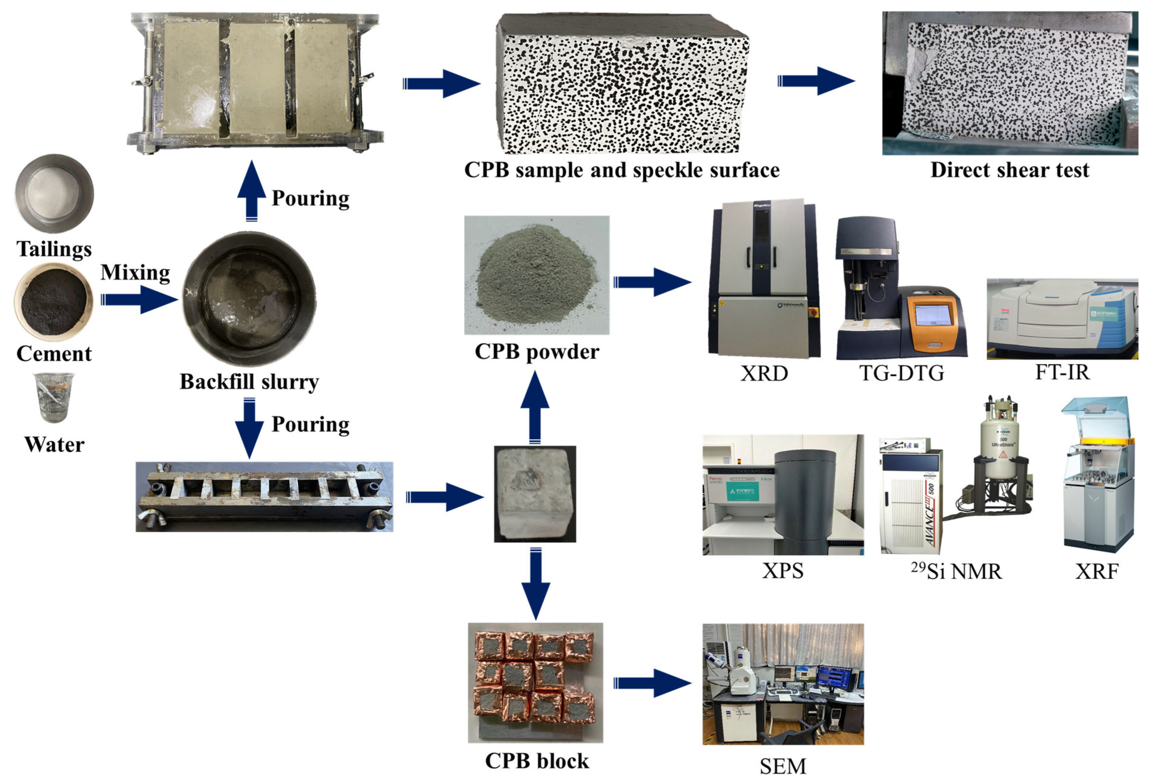 Therefore, this study aims to address the aforementioned gaps. The core innovation of this work lies in its systematic coupling of micro-scale characterization (X-ray diffraction (XRD), fourier transform infrared spectroscopy (FT-IR), XPS, TG-DTG, 29Si NMR) with macro-scale mechanical testing (direct shear tests combined with DIC). Focusing on the curing temperature range of 5–20 °C, it not only elucidates the composition and chain structure evolution of C-S-H gel in CPB but also places particular emphasis on revealing the initiation mechanisms of microstructural defects (e.g., low polymerization, high porosity, microcracking) induced by low temperatures. The research objective is to better understand the impact of low curing temperature on the hydration performance and hydration products of CPB, and to analyze its influence on macroscopic mechanical properties.