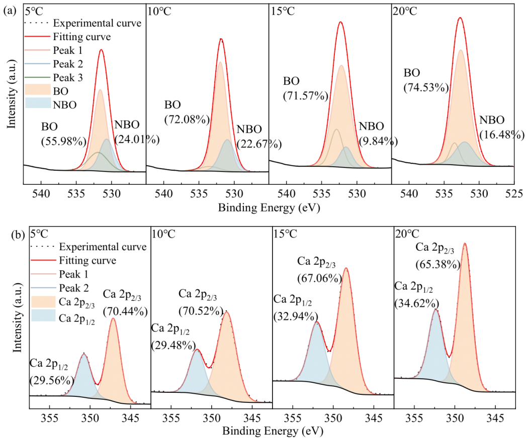 Using XPS test to determine the changes in the binding energies of O, Ca, Si, and Al elements in the secondary outer layer of CPBs under different curing temperature conditions. Figure 5 shows the XPS spectra of the main elements in CPBs under different curing temperatures. Due to the different chemical environments of atoms, the binding energy of electrons change, resulting in shifts in the spectral peaks on the spectrum. Further analysis of the chemical valence states of O and Ca elements was conducted by peak separation fitting of XPS spectra [36,37]. The BO/NBO and Ca 2p1/2/Ca 2p2/3 ratios presented here are the median values derived from peak-fitting analysis of three independent XPS measurements on parallel specimens. The relative standard deviation for these ratio determinations across the replicate measurements is within ±3.5%.