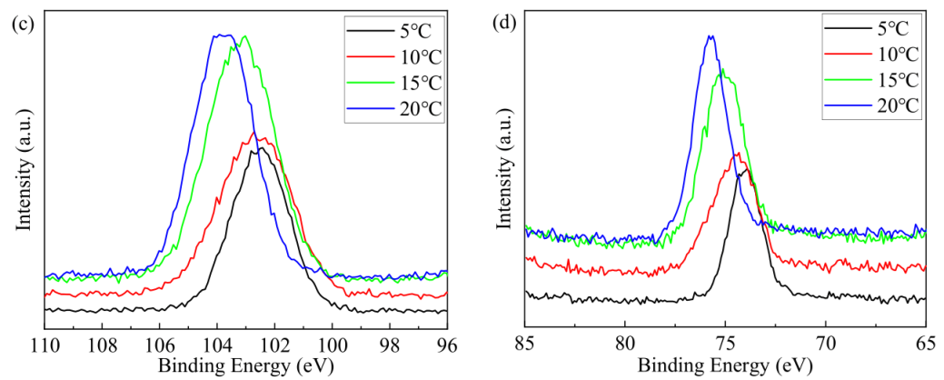 The binding energy of Ca 2p orbitals contains two characteristic peaks. According to the XPS principle, under X-ray excitation, 2p layer electrons undergo energy level splitting due to spin–orbit coupling. Therefore, the two peaks in the XPS spectra belong to Ca 2p3/2 orbitals and Ca 2pl/2 orbitals, respectively. According to the literature [39], the XPS binding energy centers of Ca 2p in dicalcium silicate and tricalcium silicate are located at 346.87 eV and 346.55 eV, respectively, similar to the Ca 2p3/2 peak with lower binding energy. The Ca 2p binding energy of C-A-S-H formed after hydration is higher, similar to the Ca 2p1/2 peak. Compared to the result under room temperature curing conditions, the binding energy of Ca 2p orbitals is lower at lower curing temperatures, and the proportion of Ca 2p3/2 peak is larger, while the proportion of Ca 2p1/2 peak is smaller.