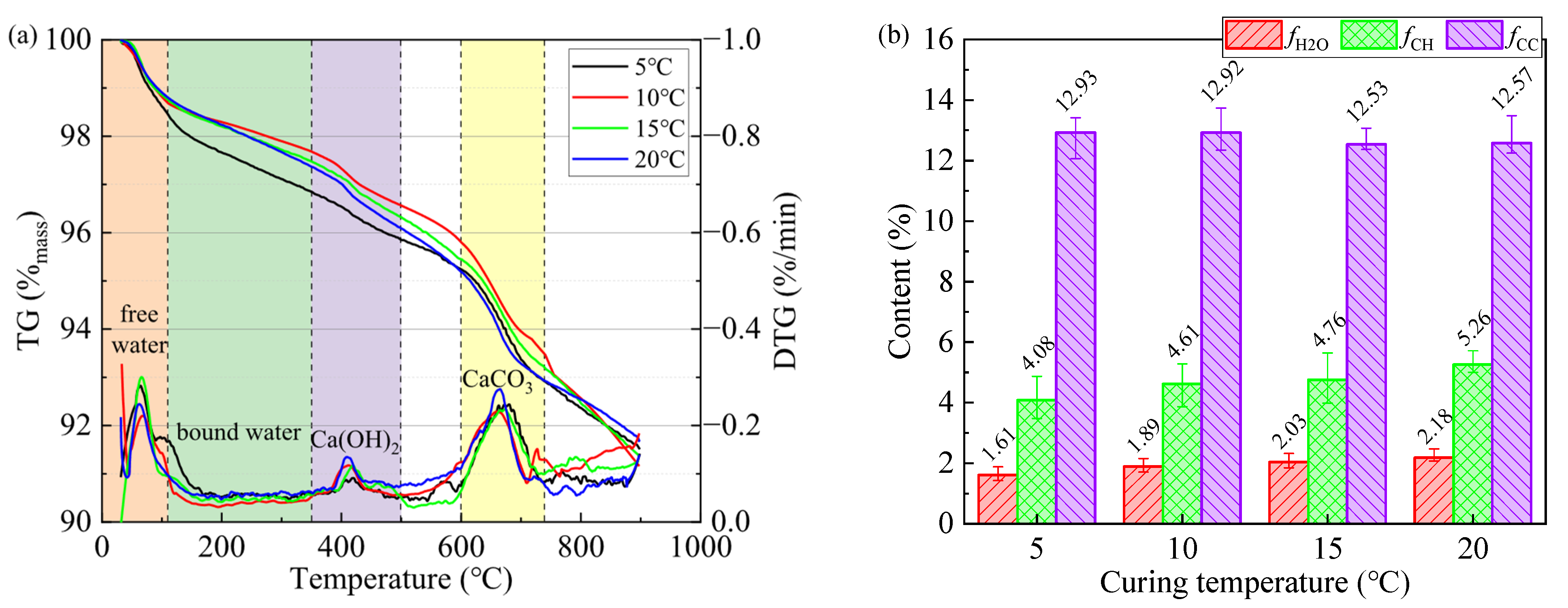 (a) TG-DTG curves and (b) quantitative analysis results of CPBs under different curing temperatures.