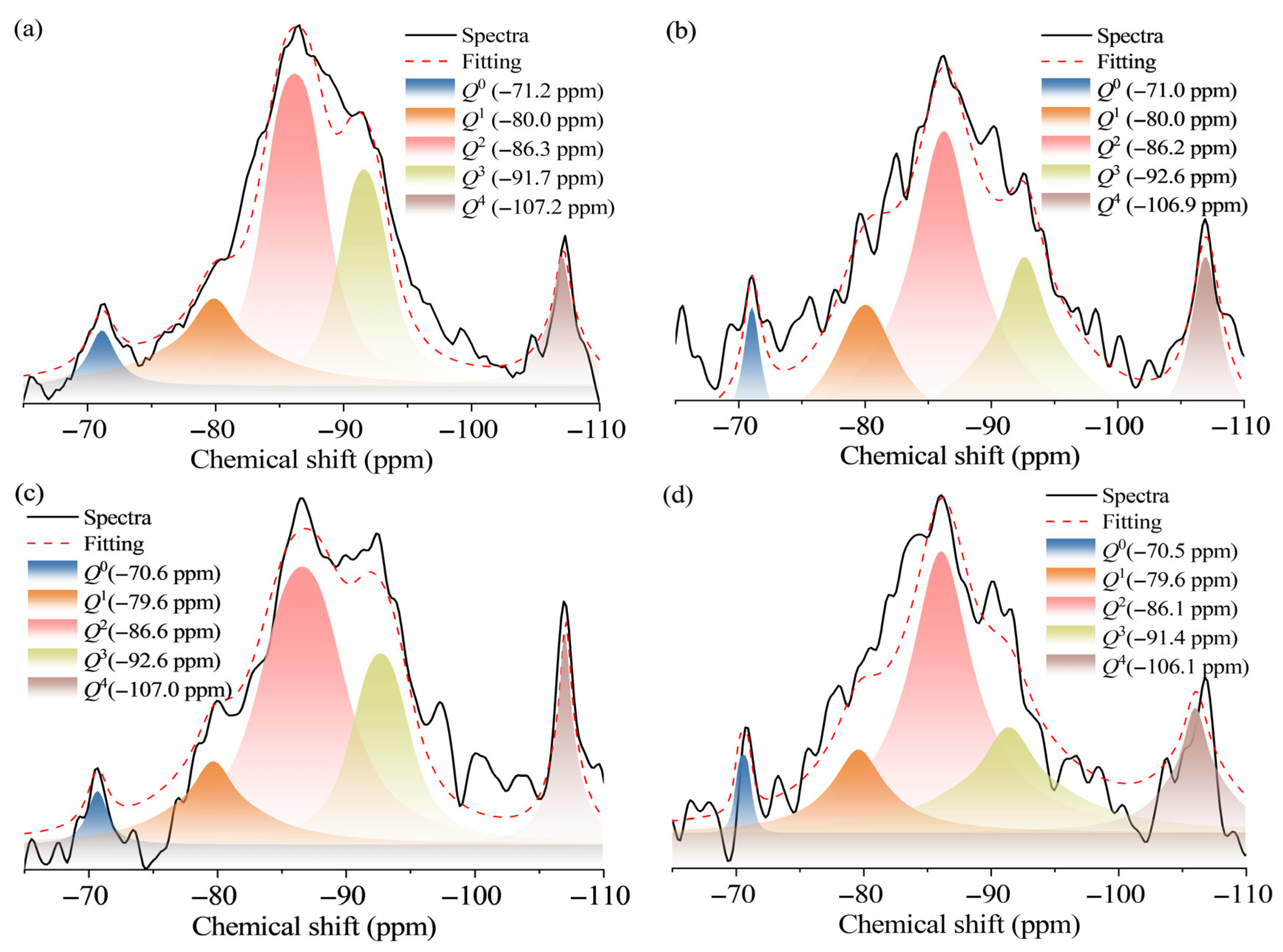 29Si NMR: The 29Si NMR experiment was conducted using Bruker Avance Neo 400 WB (Bruker BioSpin AG, Billerica, MA, USA) and the atomic structure information of the silicate chains in samples was recorded using a 7 mm CP/MAS probe. The nuclear magnetic resonance (NMR) spectrum was deconvolved and MestReNova (v15) software was used to calculate the relative proportions of each Qn unit.