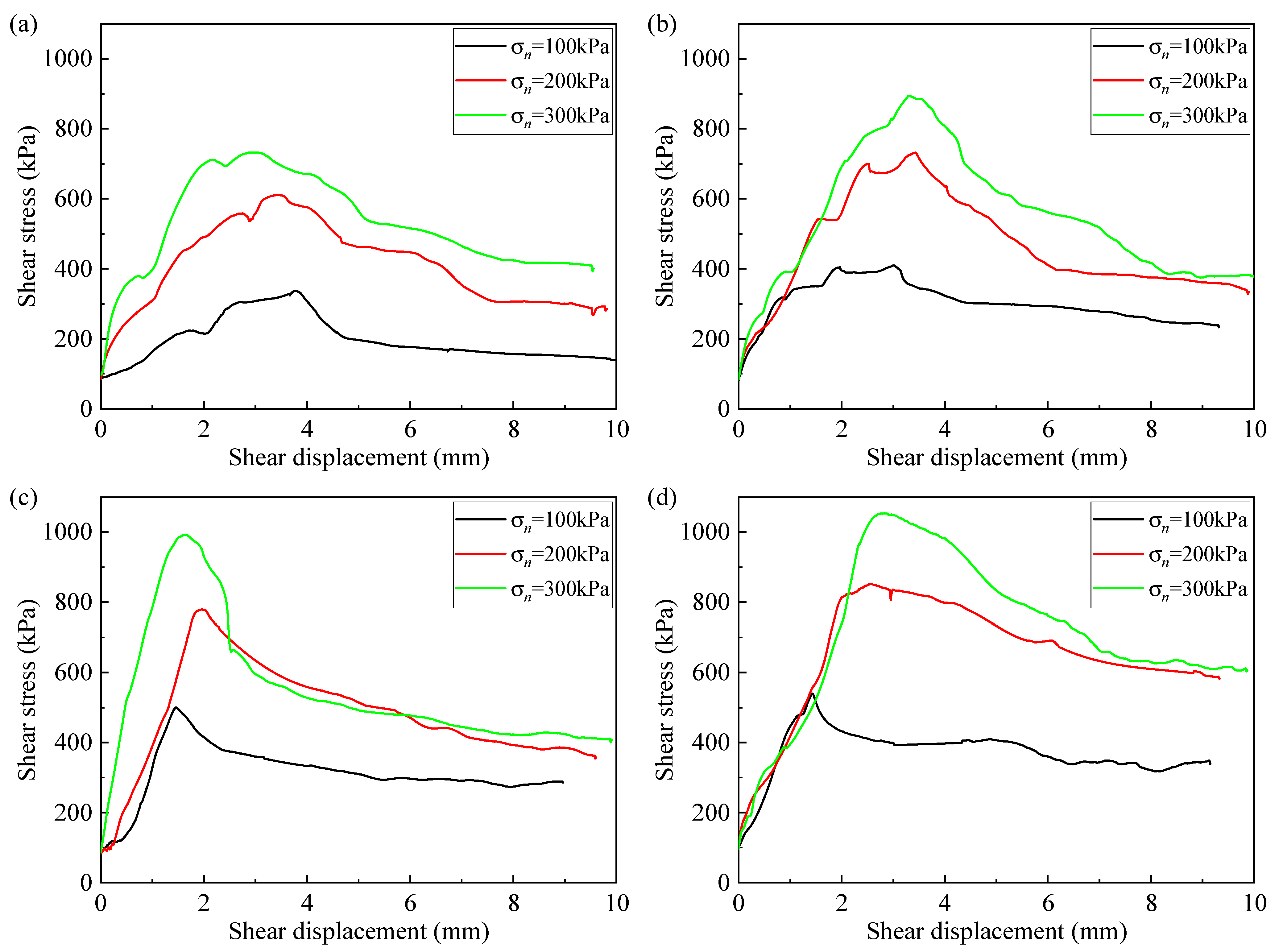 Figure 8 shows the shear stress-shear displacement curves of CPBs under different curing temperatures. The curves of different curing temperatures and normal stresses exhibit similar evolution patterns. As the shear displacement increases, the shear stress of CPBs continues to increase. Before reaching the peak shear stress, the curve can be divided into two stages: the elastic stage and the yield stage. The yielding stage mainly occurs in samples under low curing temperature conditions, where the slope of the shear stress-shear displacement curve shows a significant decrease before the peak. Under higher curing temperatures, the yielding stage of CPBs is not obvious. This is because CPB under low curing temperatures has certain plastic characteristics, and as the curing temperature increases, the CPB gradually transitions to brittleness [61]. After reaching the peak stress, the curve first enters the post-peak decline stage, and the shear stress of CPB gradually decreases with the increase in shear displacement. After a certain distance of shear, the shear stress tends to be stable, and CPB enters the post-peak stable stage.