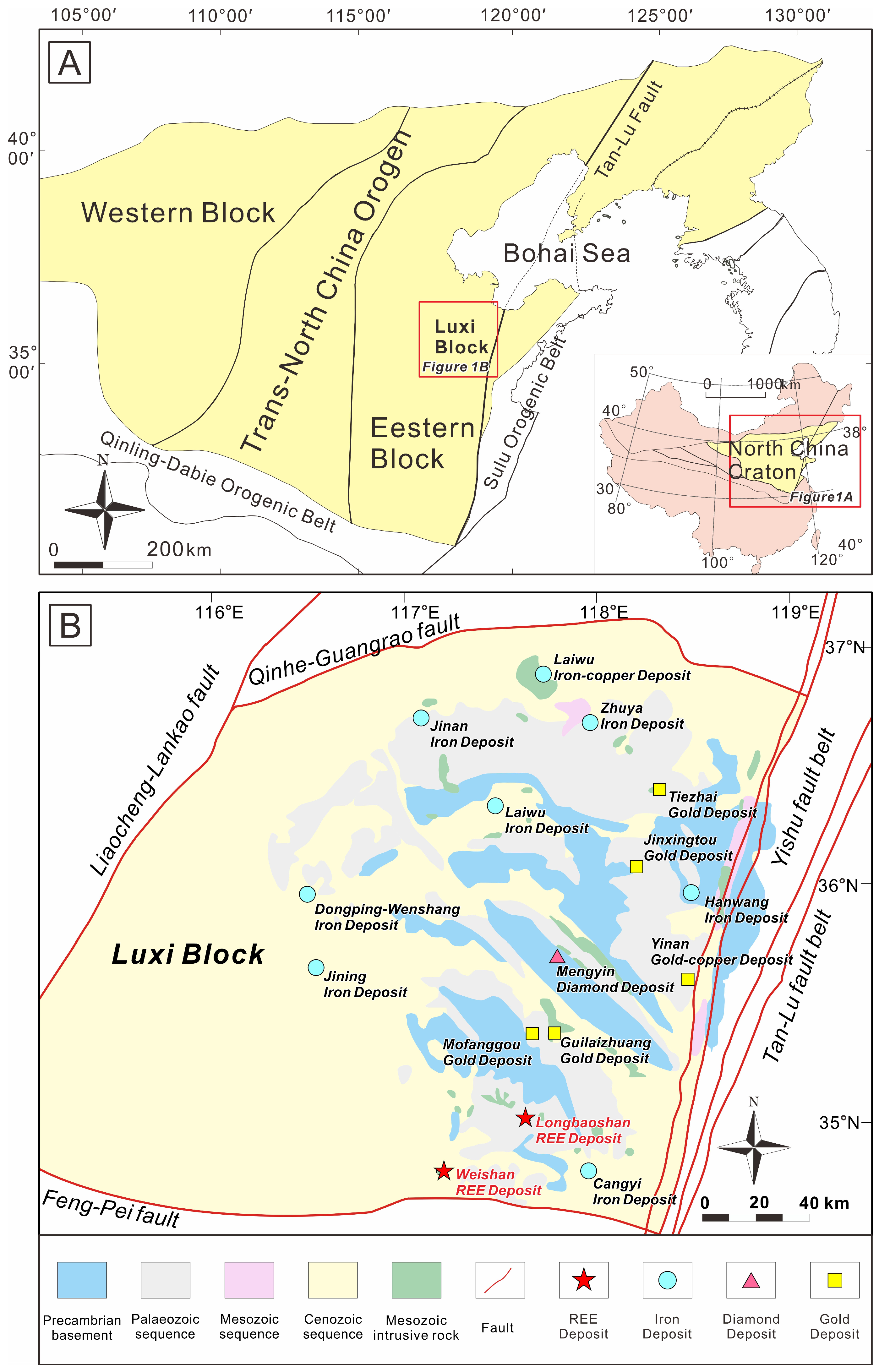 Figure 1. (A) Schematic map showing the position of the Luxi Block (modified after [66]). (B) Simplified geologic map showing the location of the Weishan area in the Luxi Terrane (modified after [21]).