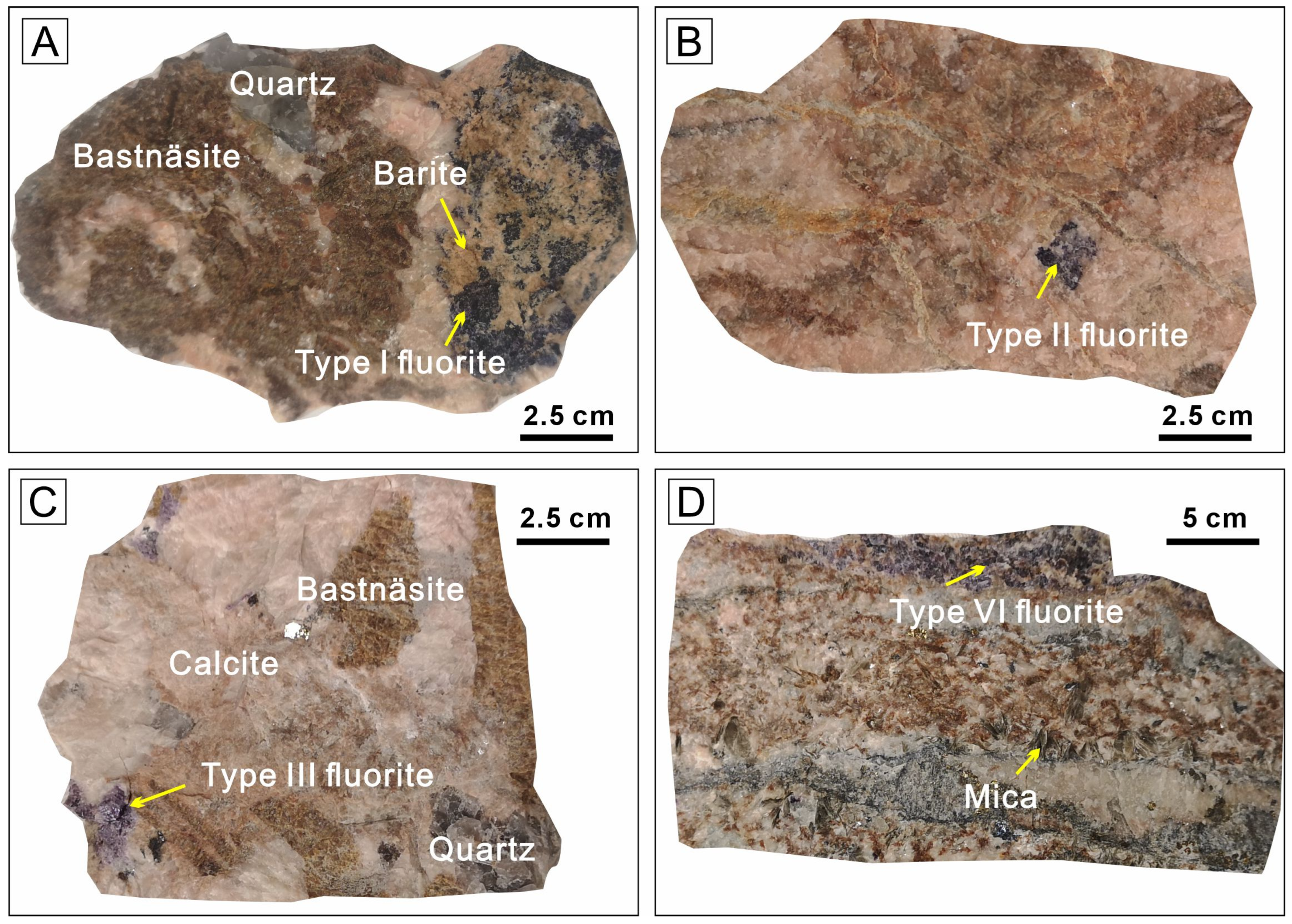 Figure 3. Representative hand specimen photograph of fluorite–REE ores from the Weishan REE deposit. (A,B) Type I and Type II fluorite from sample 20CS01 coexist with calcite, bastnäsite and barite. (C) Type III fluorite from sample 20CS06 coexist with quartz. (D) Type VI fluorite from sample 20CS06 occur in the boundary of orebody and wall-rock.