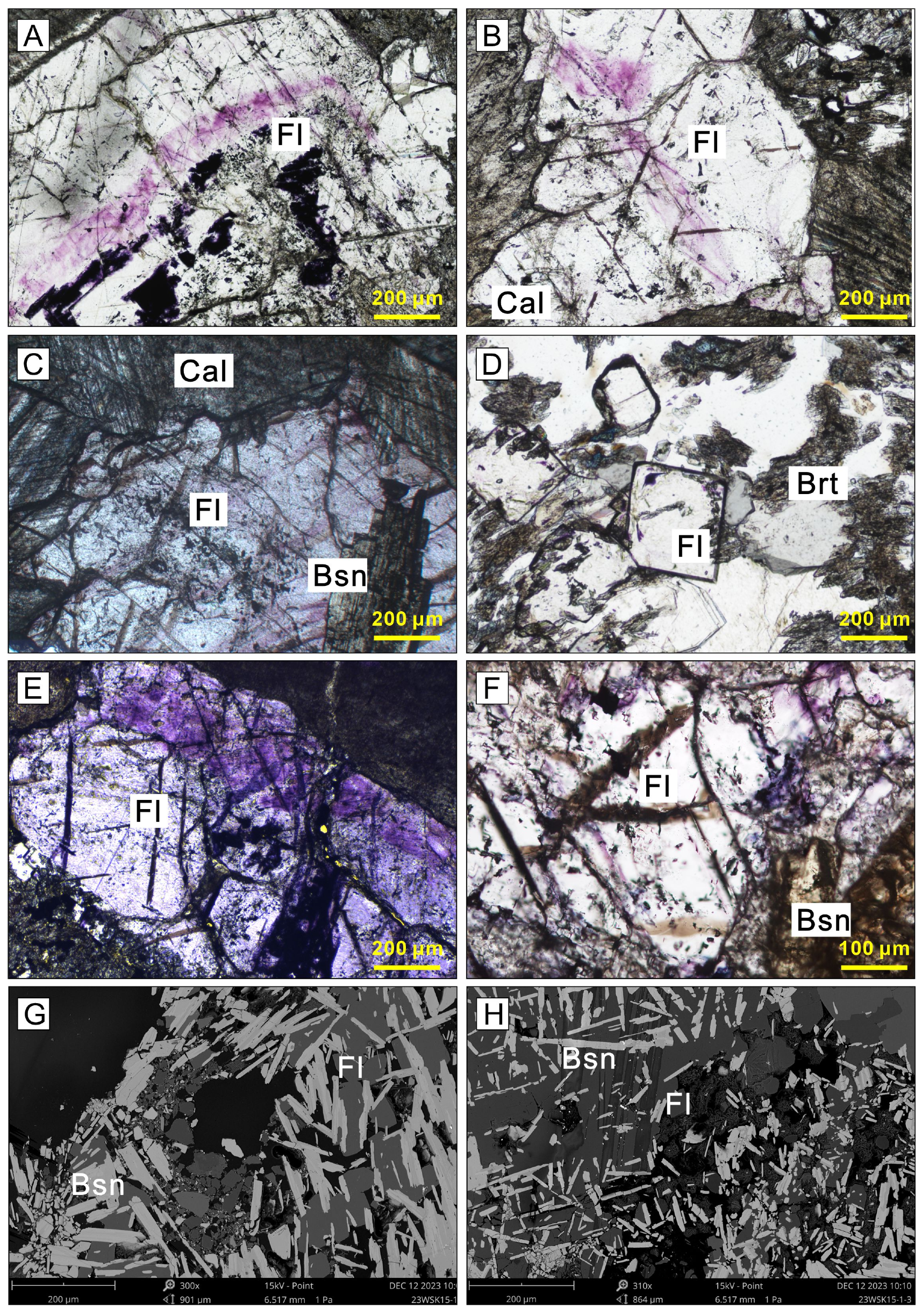 Figure 4. Petrographic characteristics of fluorite. (A) Subhedral to anhedral fluorite grains exhibiting deep purple coloration, coexisting with calcite and replaced by late-stage barite, and showing anhedral textures. (B) Subhedral fluorite crystals containing well-developed dissolution pits. (C) Fluorite associated with calcite and bastnäsite-(Ce) displaying distinct dissolution channels. (D) Euhedral fluorite grains showing peripheral dissolution pits and intergrowth with barite. (E,F) Elongated dissolution channels and corrosion pits within fluorite crystals that are locally filled by late-stage minerals. (G,H) Fluorite backscattered-electron (BSE) images show fine-grained, euhedral fluorite coexisting with acicular bastnäsite-(Ce), along with a sharp, planar contact between the two phases. Fl = fluorite; Cal = calcite; Bsn = bastnäsite; Brt = barite.