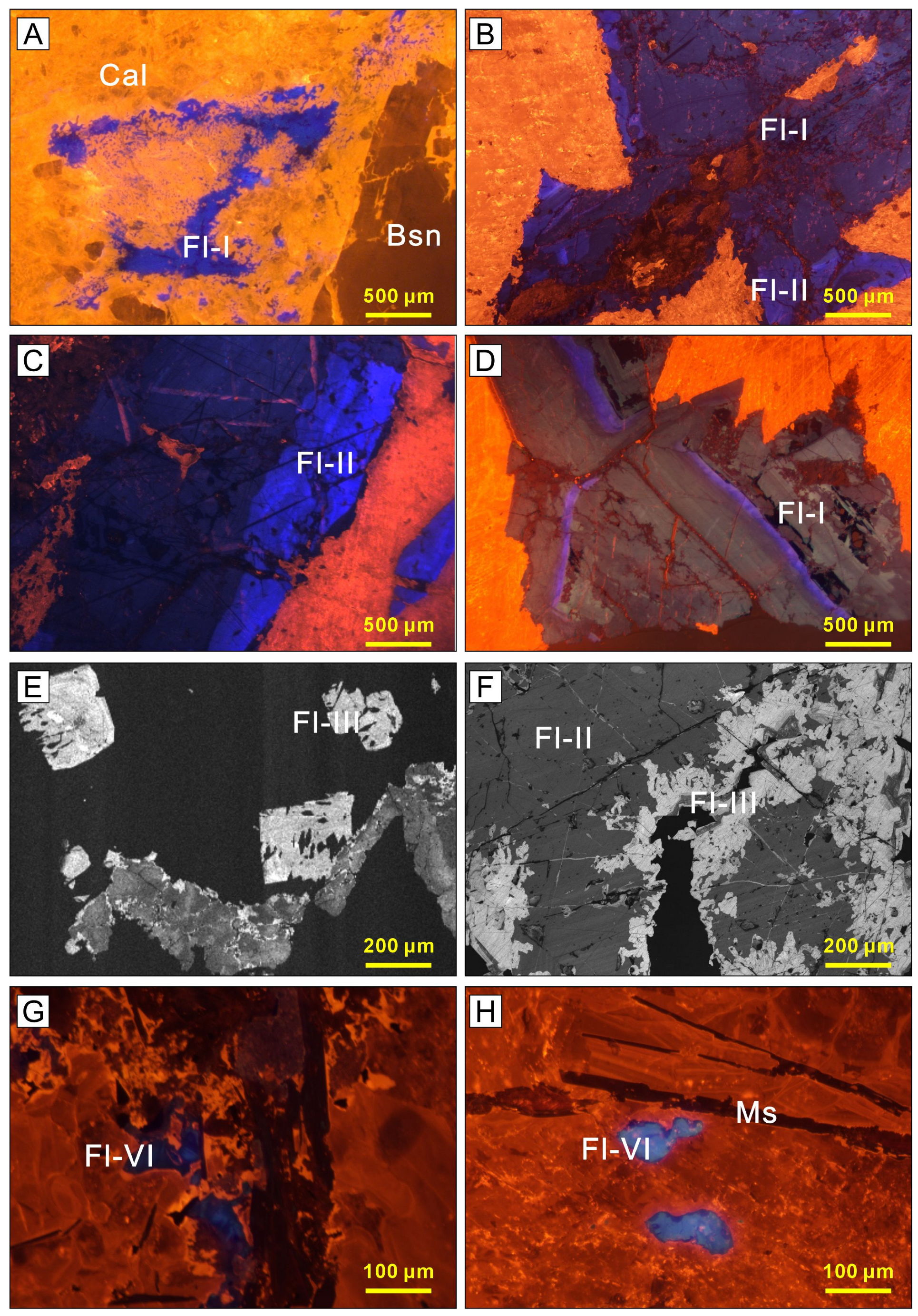 Figure 5. Cathodoluminescence characteristics of fluorite. (A,B) Type 1 anhedral fluorite coexisting with bastnäsite-(Ce) and replaced by calcite showing metasomatic textures; dissolution channels are developed within the crystals, with remnants of growth zoning preserved. (C,D) Elongated dissolution channels and corrosion pits within fluorite crystals filled by late-stage minerals; the contact between Type 1 and Type 2 fluorites is irregular. (E,F) SEM-CL images show that Type 3 fluorite developed along the margins of Type 2 fluorite, exhibiting distinct cathodoluminescence characteristics; minor dissolution pits occur along the crystal edges of Type 3 fluorite. (G,H) Type 4 fluorite coexisting with mica and filling interstitial spaces between calcite grains.
