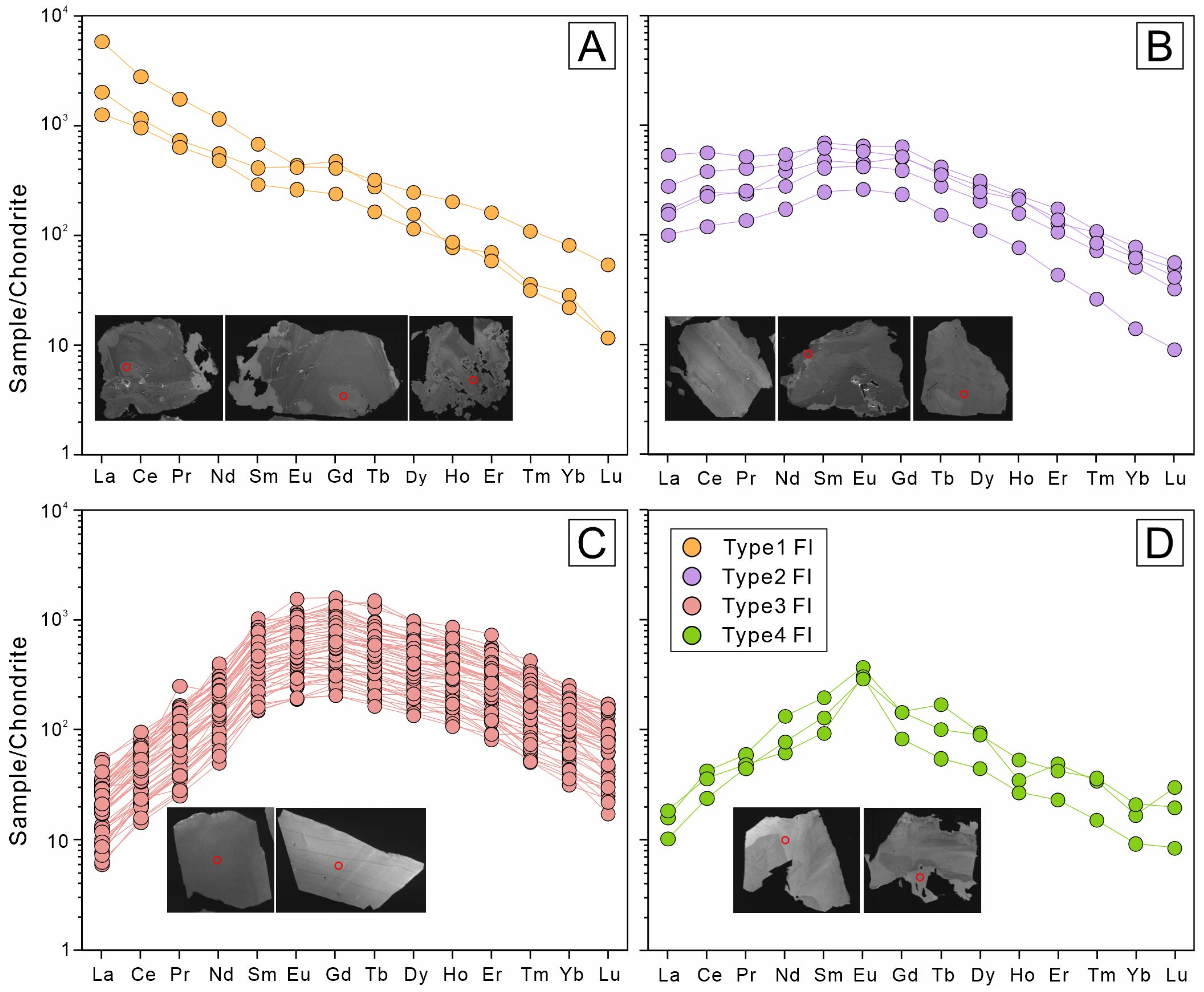 Figure 6. Chondrite-normalized REE patterns of fluorites from different generations. (A) Type 1 fluorite show strongly LREE enrichment REE. (B) Type 2 fluorite shows a relatively flat REE pattern. (C) Type 3 fluorite is marked by a left-sloping pattern with MREE enrichment. (D) Type 4 fluorite exhibits an overall flat REE distribution.
