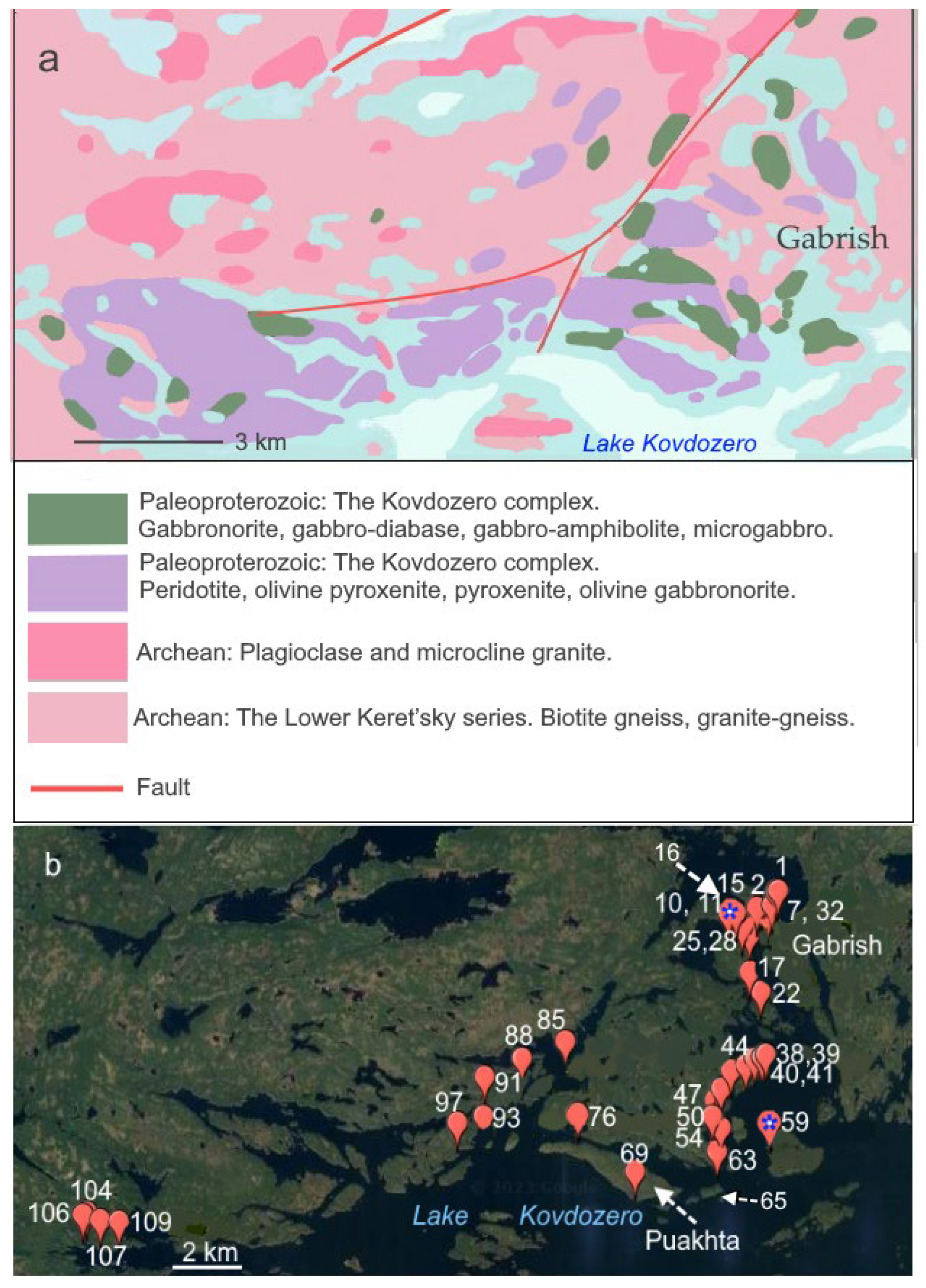 - Efimov, A.A.; Kaulina, T.B. Geological features and U–Pb dating (first data) in the southeastern part of the Kovdozero basic–ultrabasic massif (Puakhta block). In The Belomorian Mobile Belt (Geology, Geodynamics, Geochronology); Karelian Science Centre RAS: Petrozavodsk, Russia, 1997; p. 31. (In Russian) [Google Scholar]