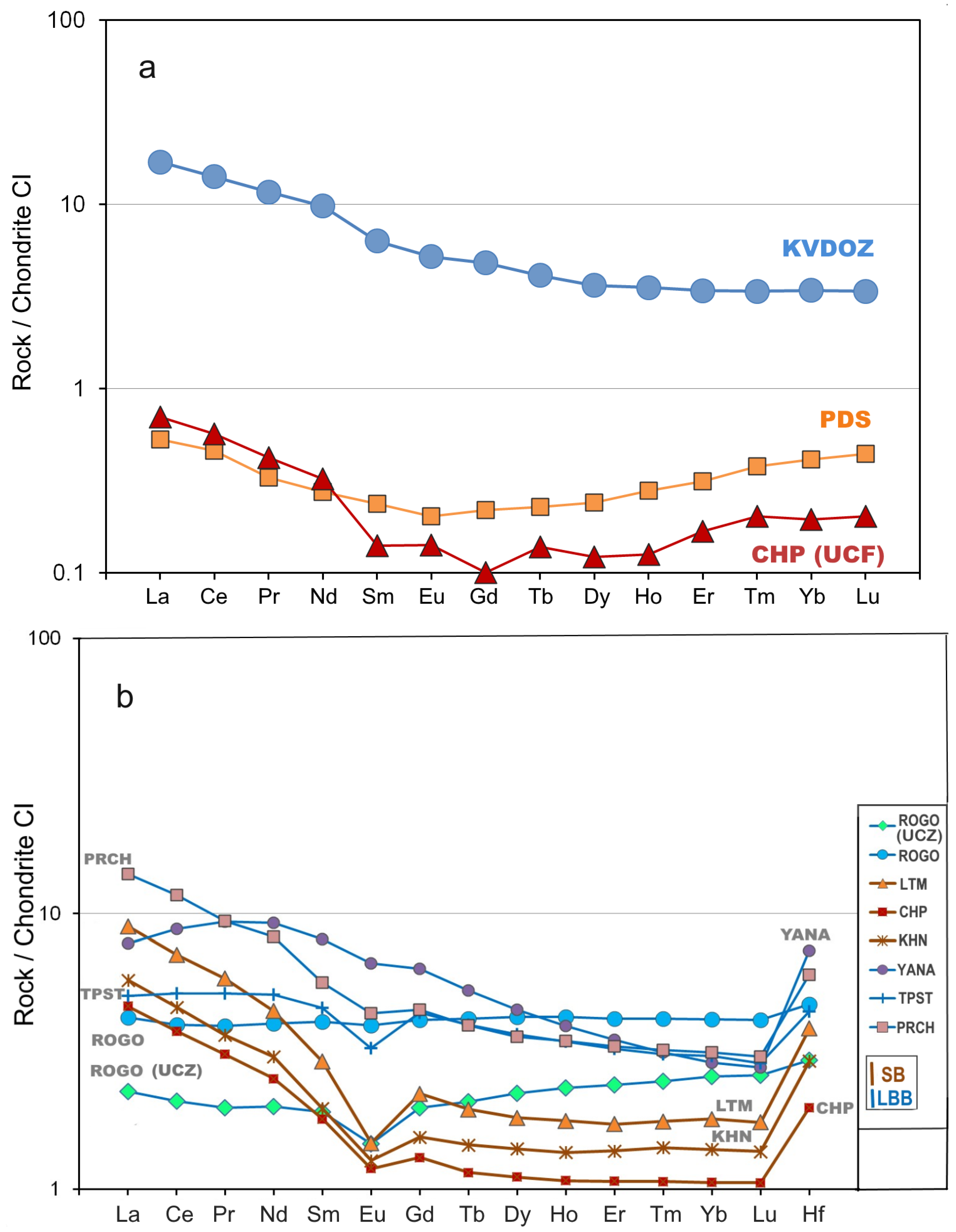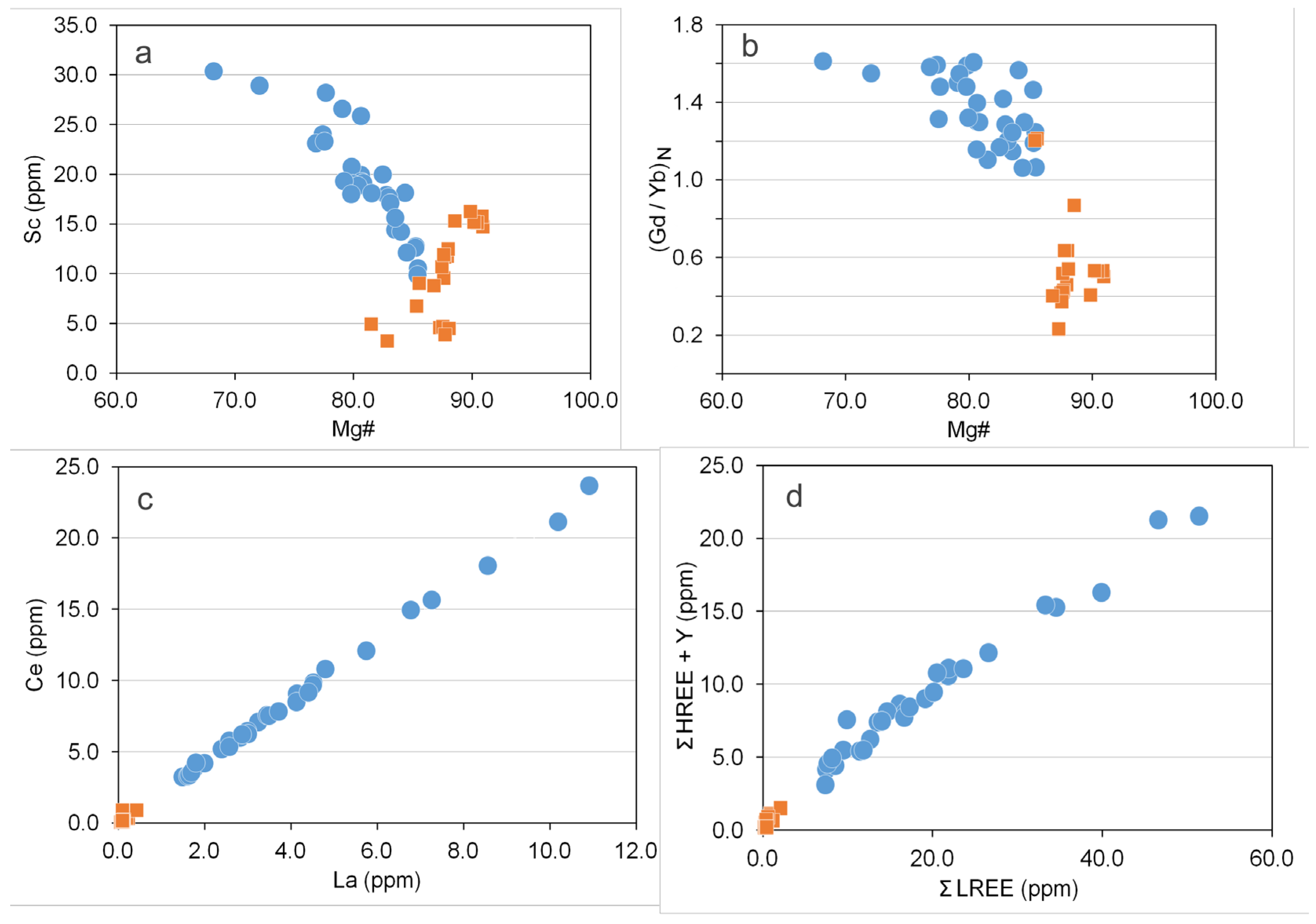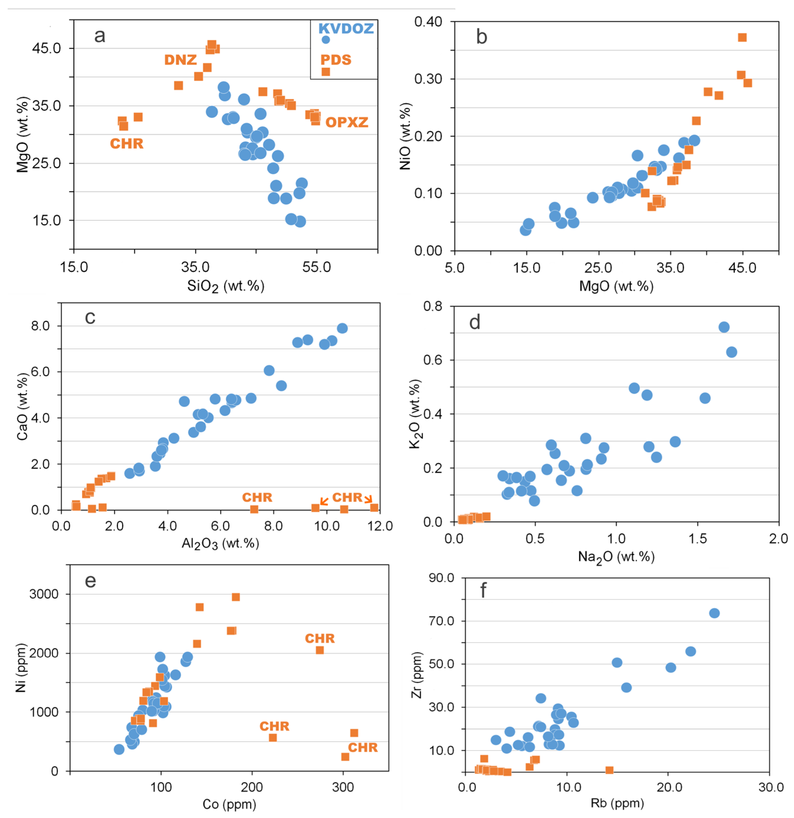 | Geochemical characteristics | Rocks display trends of relative enrichment in CaO, Al2O3, alkalis, REE, incompatible and high field-strength elements (this study) | Rocks are strikingly poor in CaO, Al2O3, alkalis, and depleted in incompatible and high field-strength elements with extremely low abundances of REE (this study) |