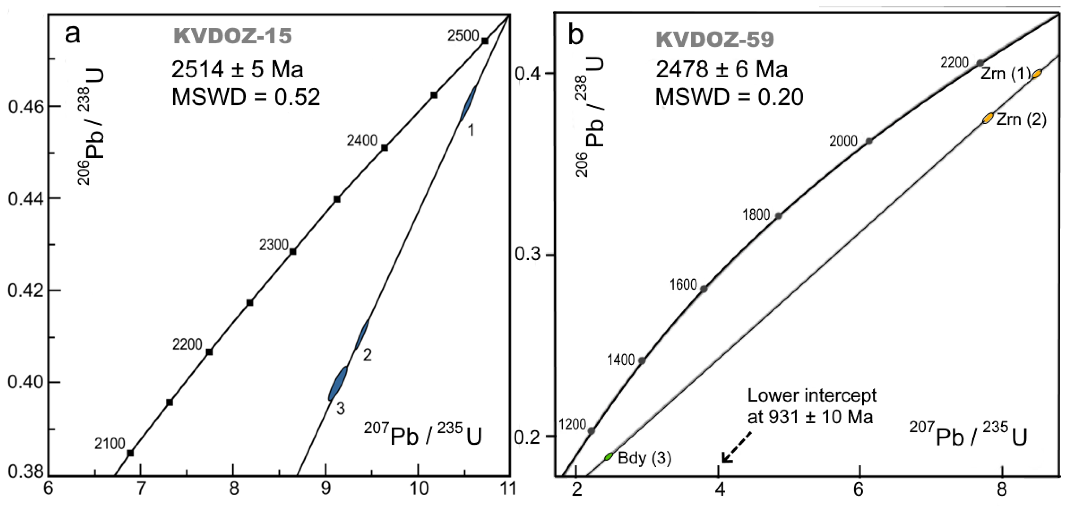 | Isotopic age | 2514 ± 5 Ma (zircon U–Pb dating) (this study) | 2485 ± 38 Ma (Sm–Nd dating) [9] |