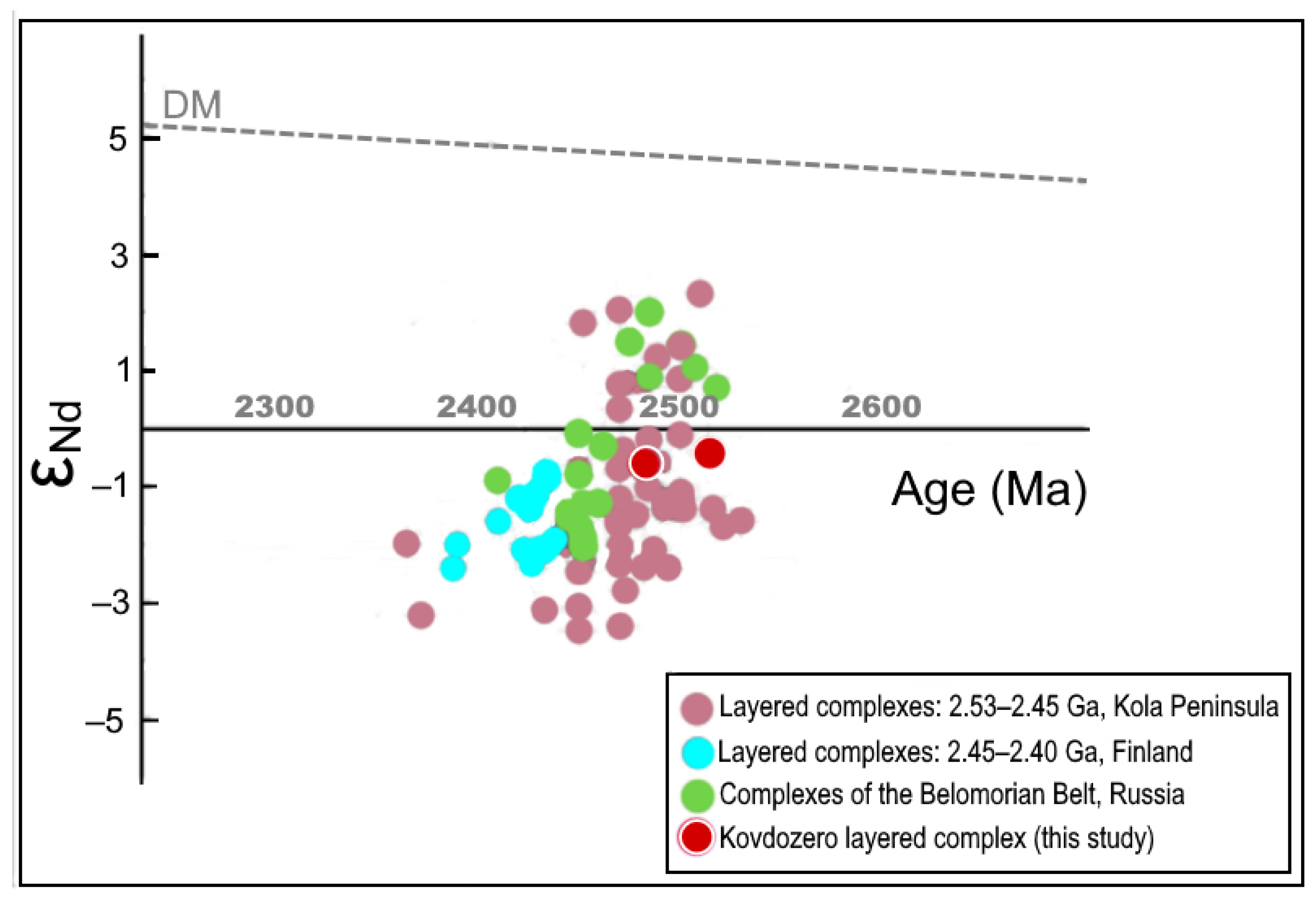 - The leucocratic gabbroic rocks at Kovdozero and the gabbro–anorthosite rocks of the Belomorian province seem to be the final products linked to the diapiric megastructure. The εNd(T) values obtained at Kovdozero, −0.43 and −0.60, indicate a certain degree of crustal contamination of the initial magma.
