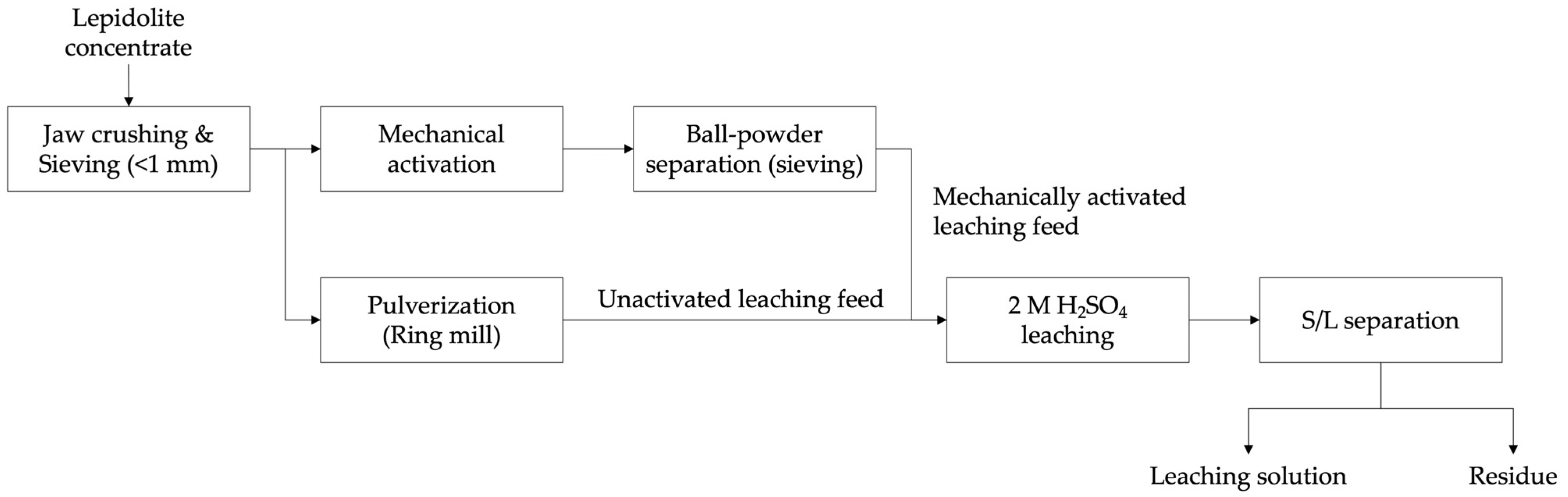 - Olaoluwa, D.T.; Baba, A.A.; Oyewole, A.L. Beneficiation of a Nigerian lepidolite ore by sulfuric acid leaching. Miner. Process. Extr. Metall. 2023, 132, 134–140. [Google Scholar] [CrossRef]