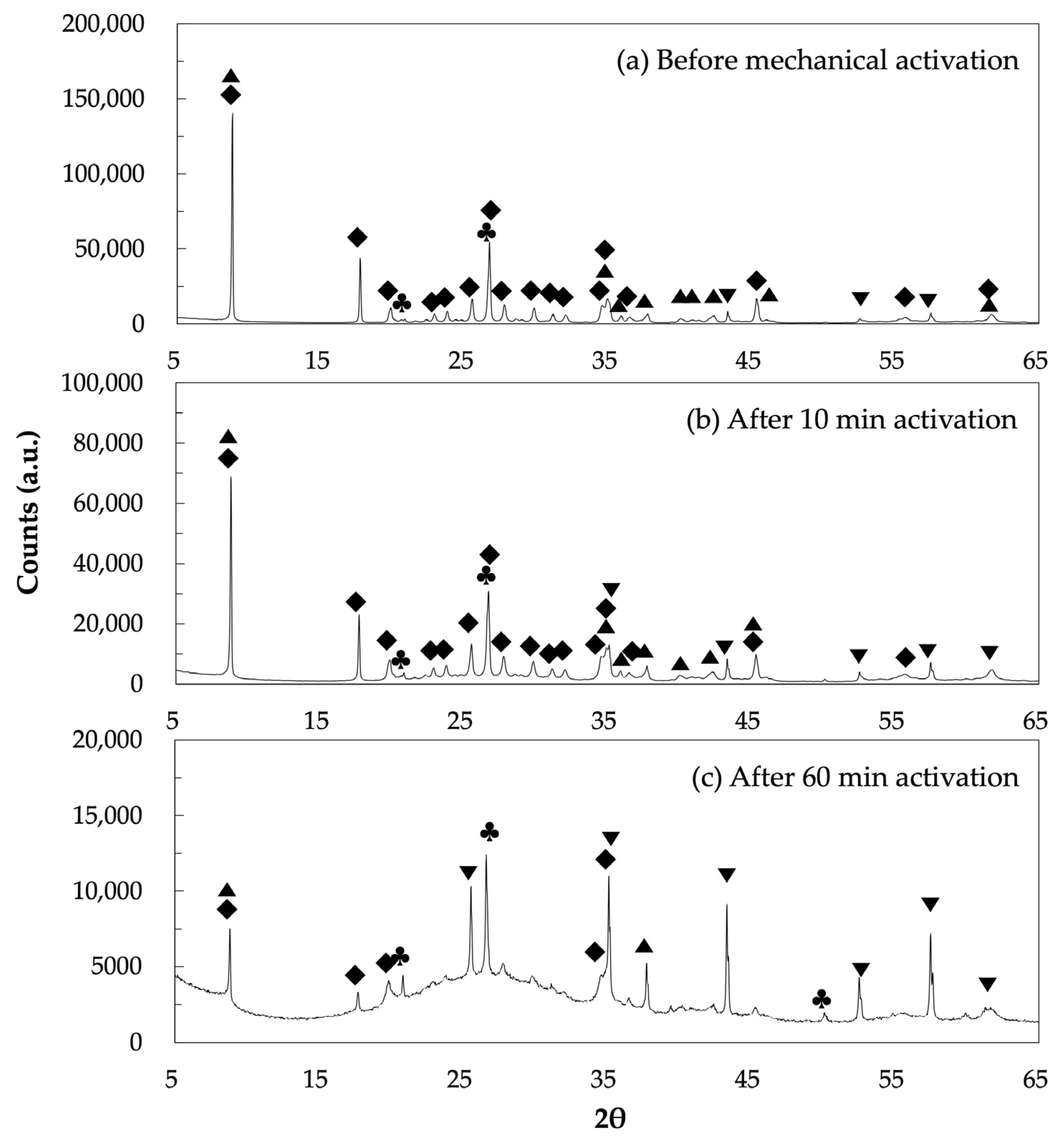 - Baki, V.A.; Ke, X.; Heath, A.; Calabria-Holley, J.; Terzi, C.; Sirin, M. The impact of mechanochemical activation on the physicochemical properties and pozzolanic reactivity of kaolinite, muscovite and montmorillonite. Cem. Concr. Res. 2022, 162, 106962. [Google Scholar] [CrossRef]