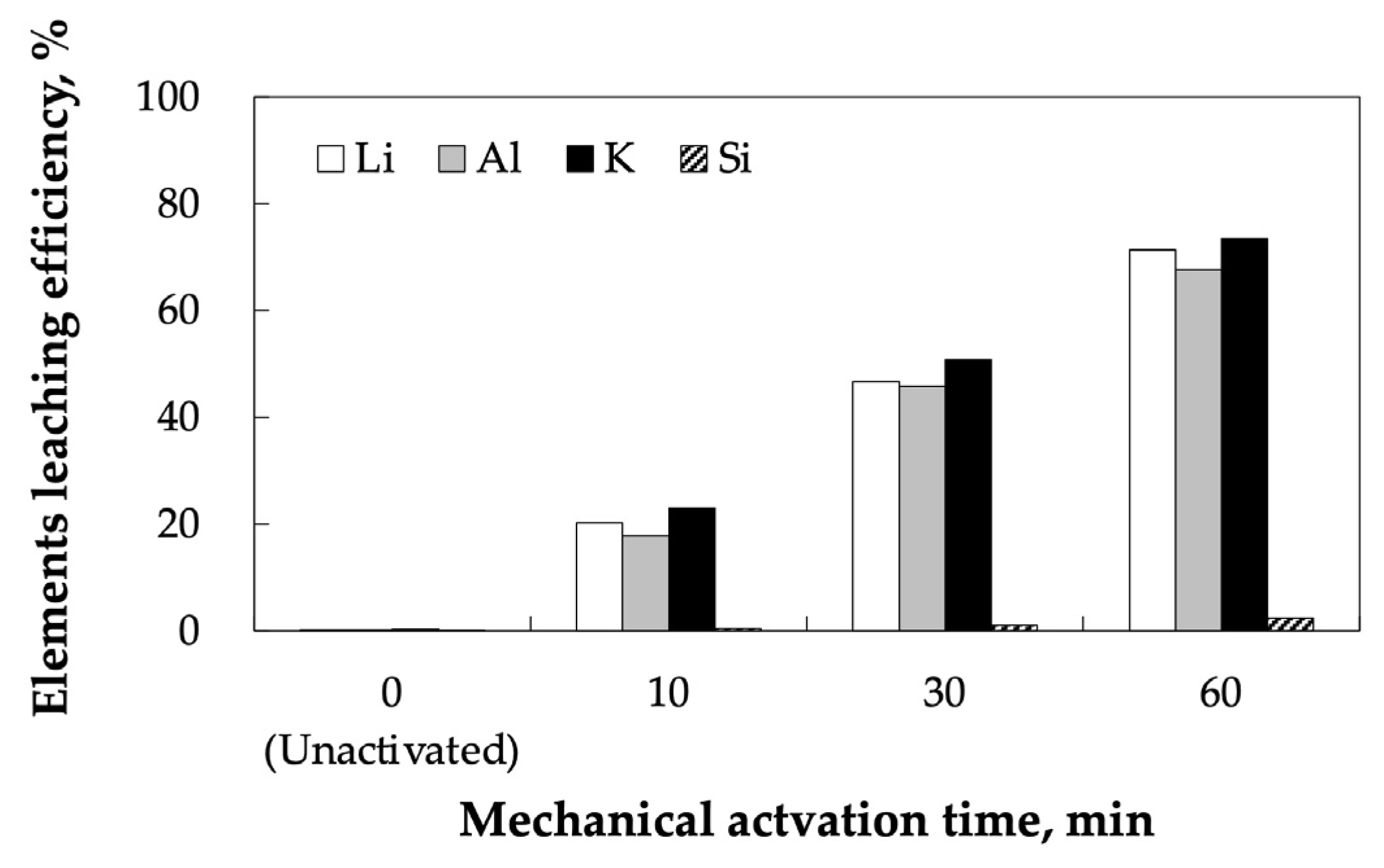 - Vieceli, N.; Nogueira, C.A.; Pereira, M.F.; Dias, A.P.S.; Durão, F.O.; Guimarães, C.; Margarido, F. Effects of mechanical activation on lithium extraction from a lepidolite ore concentrate. Miner. Eng. 2017, 102, 1–14. [Google Scholar] [CrossRef]