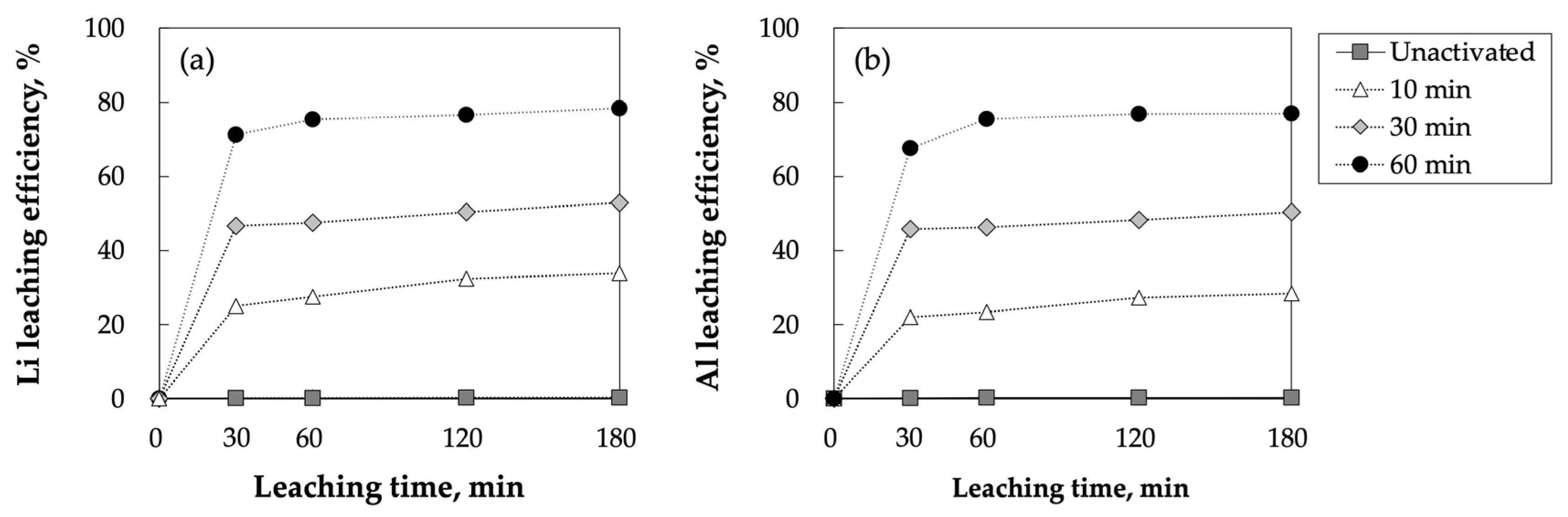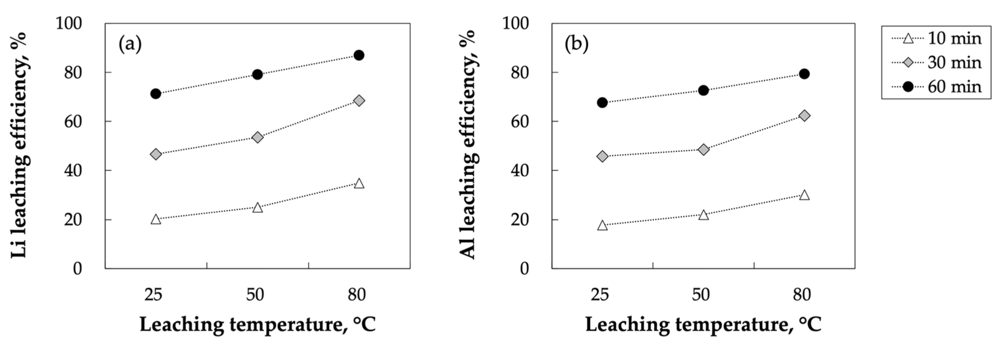 3.2.2. The Effect of Leaching Time and Temperature on Li and Al Leaching Efficiency