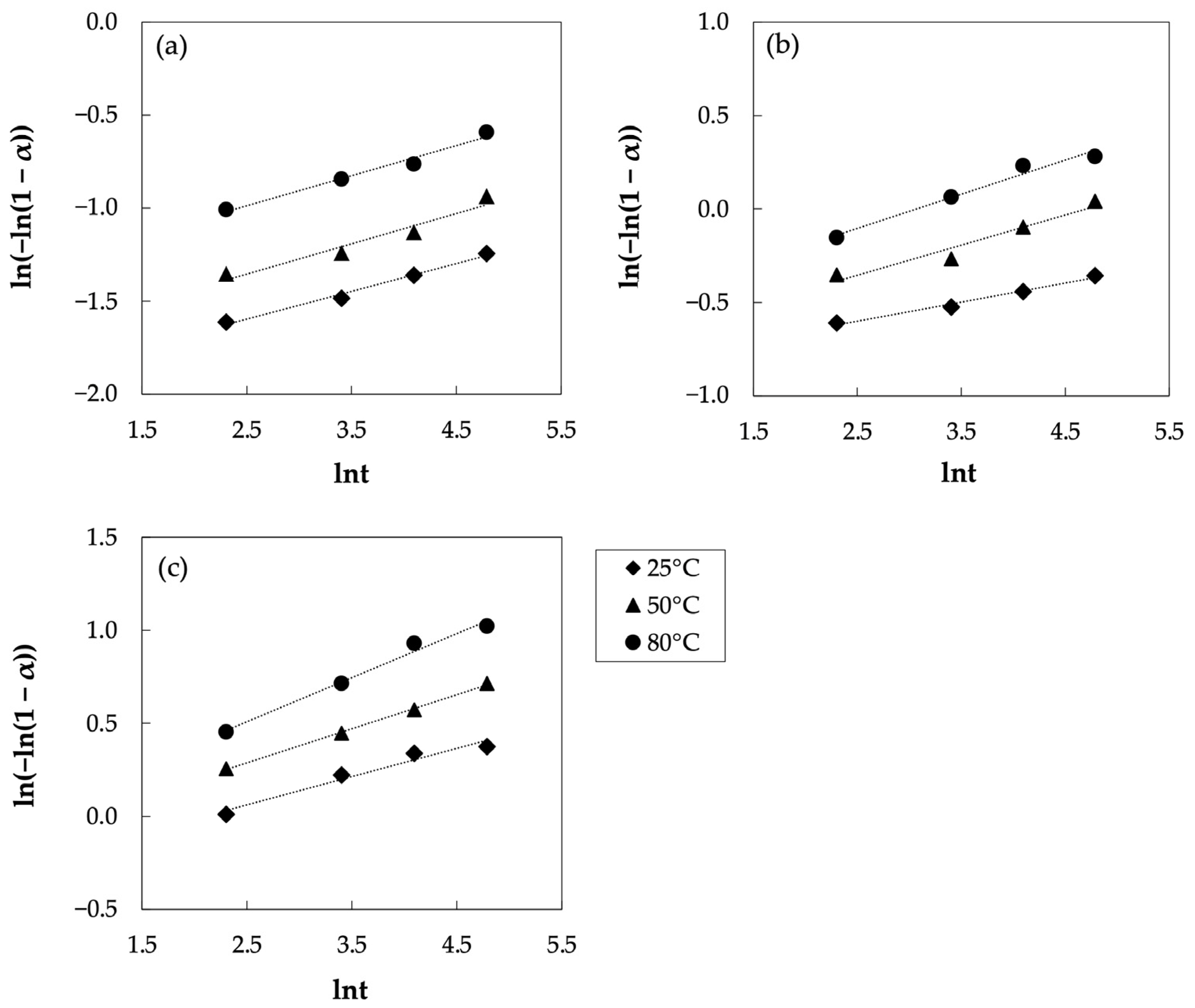 - ɑ is leaching result, k is the rate constant, t is reaction time, and n is Avrami exponent. The value of the Avrami exponent enables the identification of the rate-controlling mechanism, with 1 > n ≥ 0.5 indicating a mixed chemical reaction–diffusion control and n < 0.5 indicating diffusion-controlled [35].