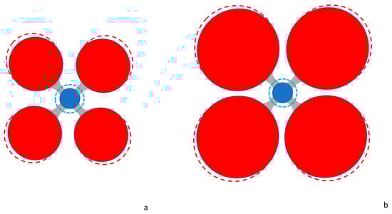 Figure 2. A simple 2-dimensional illustration of the steric effect of a marked reduction in the ionic volume of O2−, as it occurs at the 410- and 670 km boundaries. Red circles = O2−, blue circles = cation. The radius of the cation is the same in both figures, but in (a) the radius of O2− is reduced by 2. Grey areas indicate the bond vectors (a square 4-fold coordination in this case, which may be taken for a cut through the base plane of an octahedron). Next it is assumed that the cation is substituted by a larger ion (blue dashed circle, again of equal radius in (a) and (b)): With bond distance constant O2− is pushed further out (dashed red circles), thus increasing the polyhedral volume but significantly less so for large compared to small O2−. In this illustration the effect is shown for an area only, but it is easily conceived that the effect is more pronounced in volume. This suggests that polyhedra with large contribution of the anions to the volume are more compatible with cation substitution than those with small anions.