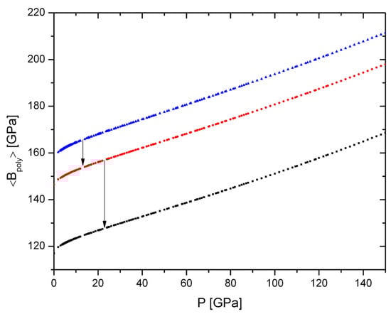 Figure 3. Evolution of ⟨Bpoly⟩, the average value of the polyhedral volume for pyrolitic mantle with blue = upper-, black = lower mantle, red = transition zone. Equivalent to the volumetric fraction of O2− as a function of pressure, the average polyhedral volume increases with pressure but drops markedly at both major mantle discontinuities (indicated by arrows).