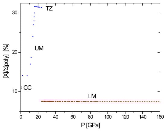 Most trace elements are expected to have preferences for specific sites. In fact, most of the incompatible elements concentrate in clinopyroxene in the shallow region of, and in garnet in, the deeper upper mantle and in the transition zone, whereas in the lower mantle they take refuge in the crystal lattice of davemaoite [18,19]. In the light of pressure-dependent ionic radii, this observation is further quantified: We take the percentage of large polyhedral sites, which are known to host the geochemically most important incompatible elements such as the rare earth elements, the large ionic lithophiles, and the heavier high-field-strength elements for upper mantle, transition zone, and lower mantle as
