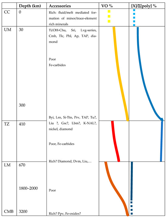 The following picture of richness in mineral species in different regions of the Earth’s mantle is proposed (Figure 5).