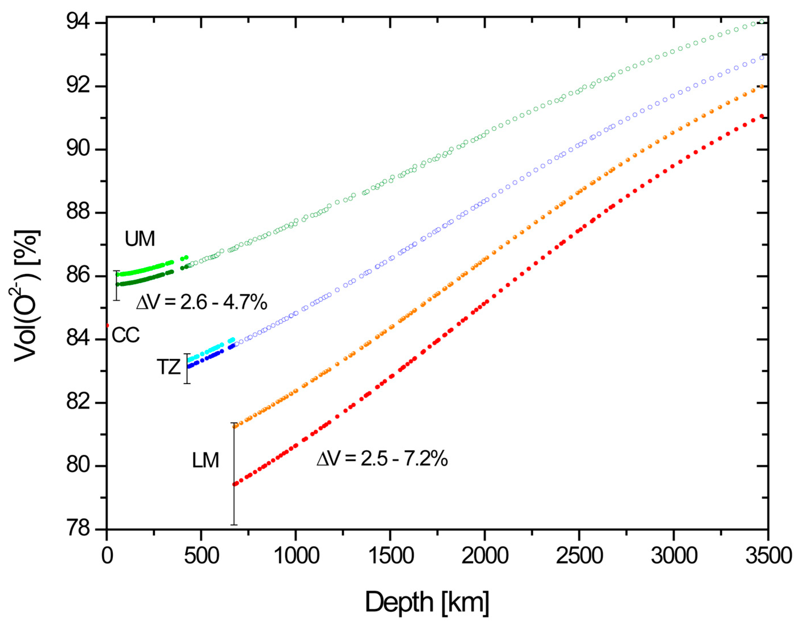 - VO, the volume fraction of O2− ions of the total ionic volume of BSE, increases monotonously with pressure for each of the three mantle zones, such that in extrapolation from the top to the bottom of the whole mantle, VO gains 6-7% to 91.0 ± 1.0% (Figure 1).
