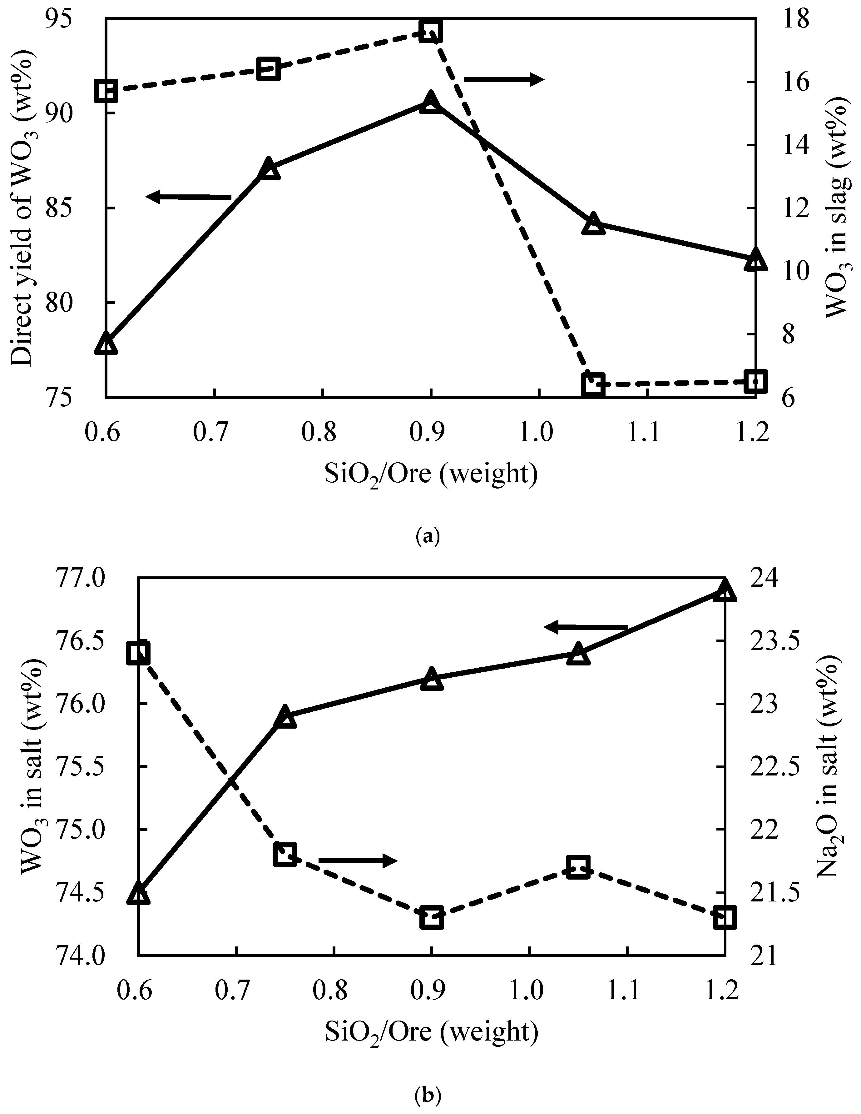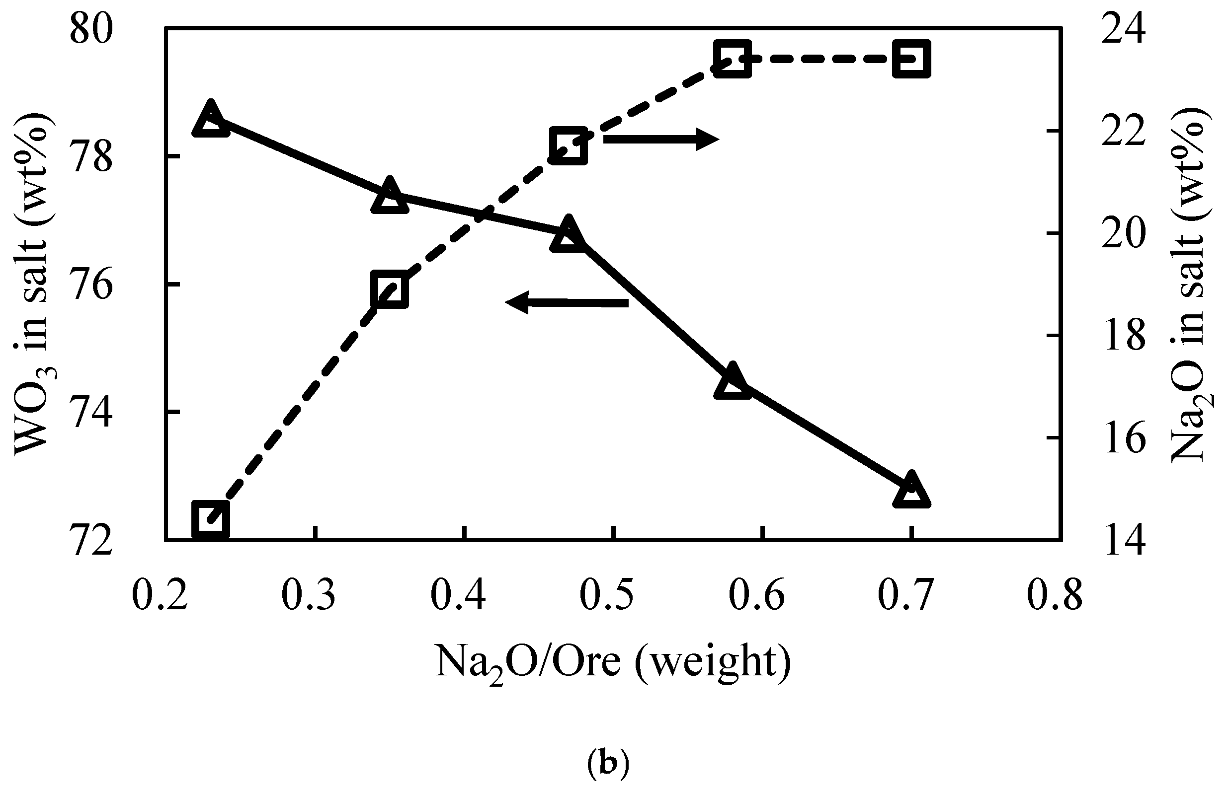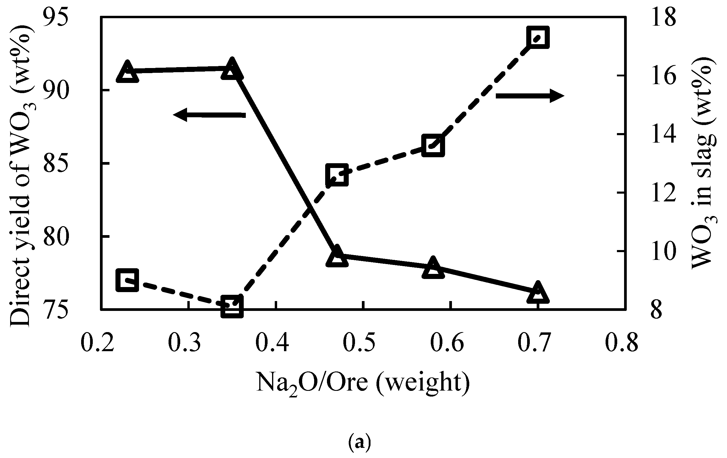 3.2.1. Effect of Na2O/Ore Mass Ratio on Direct Yield of WO3 and Salt Composition