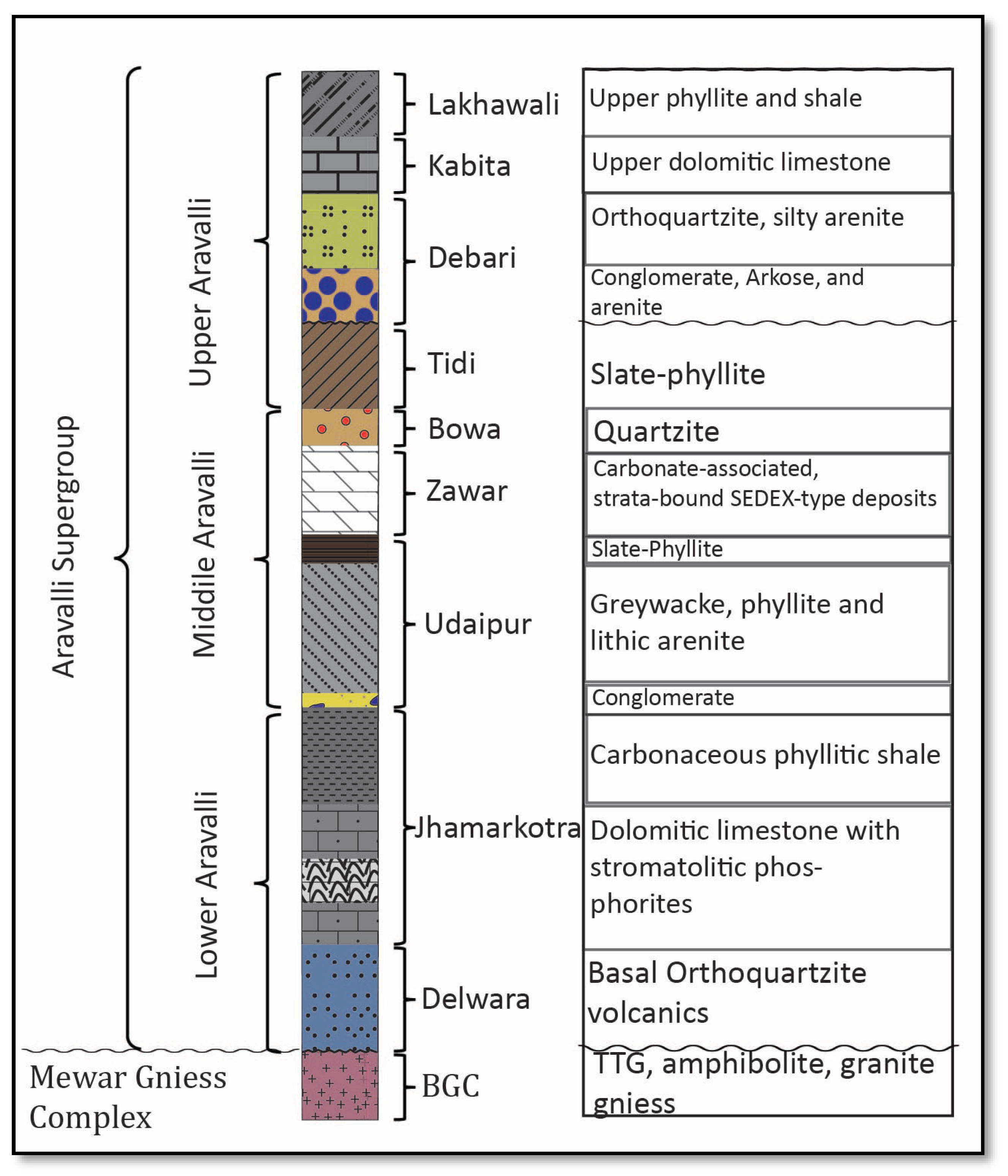 In the Udaipur sector, the MGC is overlain by meta-basalts and quartzites, which constitute the basal Delwara Formation of the Aravalli Supergroup. The lithostratigraphy of the Delwara Formation indicates a rift-basin tectonic setting. The Delwara Formation is overlain by the Jhamarkotra Formation, containing stromatolitic carbonates enriched in phosphorite (Figure 1c). The Lower Aravalli Group was deposited in shallow-marine depositional environments on a passive continental margin [48]. The Middle Aravalli Group, unconformably overlying the Jhamarkotra Formation, contains deep-water, turbidite sequences of the Udaipur Formation, characterized by metagreywackes and phyllites, indicating a drawdown of the carbonate platform and a change in the tectonic regime. The overlying dolostones and calc-silicate rocks of the Zawar, Bowa, and Tidi formations host SEDEX-type mineral deposits, as well as quartzite and phyllite–dolostone–quartzite intervals, indicating shallow-marine depositional conditions. The Debari Formation quartzites, Kabita Dolomite, and Lakahawali phyllites of the Upper Aravalli Group represent shallow-water sedimentation on the eastern shelf. In contrast, mica schists and ultramafic rocks of the Jharol Formation represent deep-sea sedimentation in the western, open-marine basin (Figure 2; [45]).
