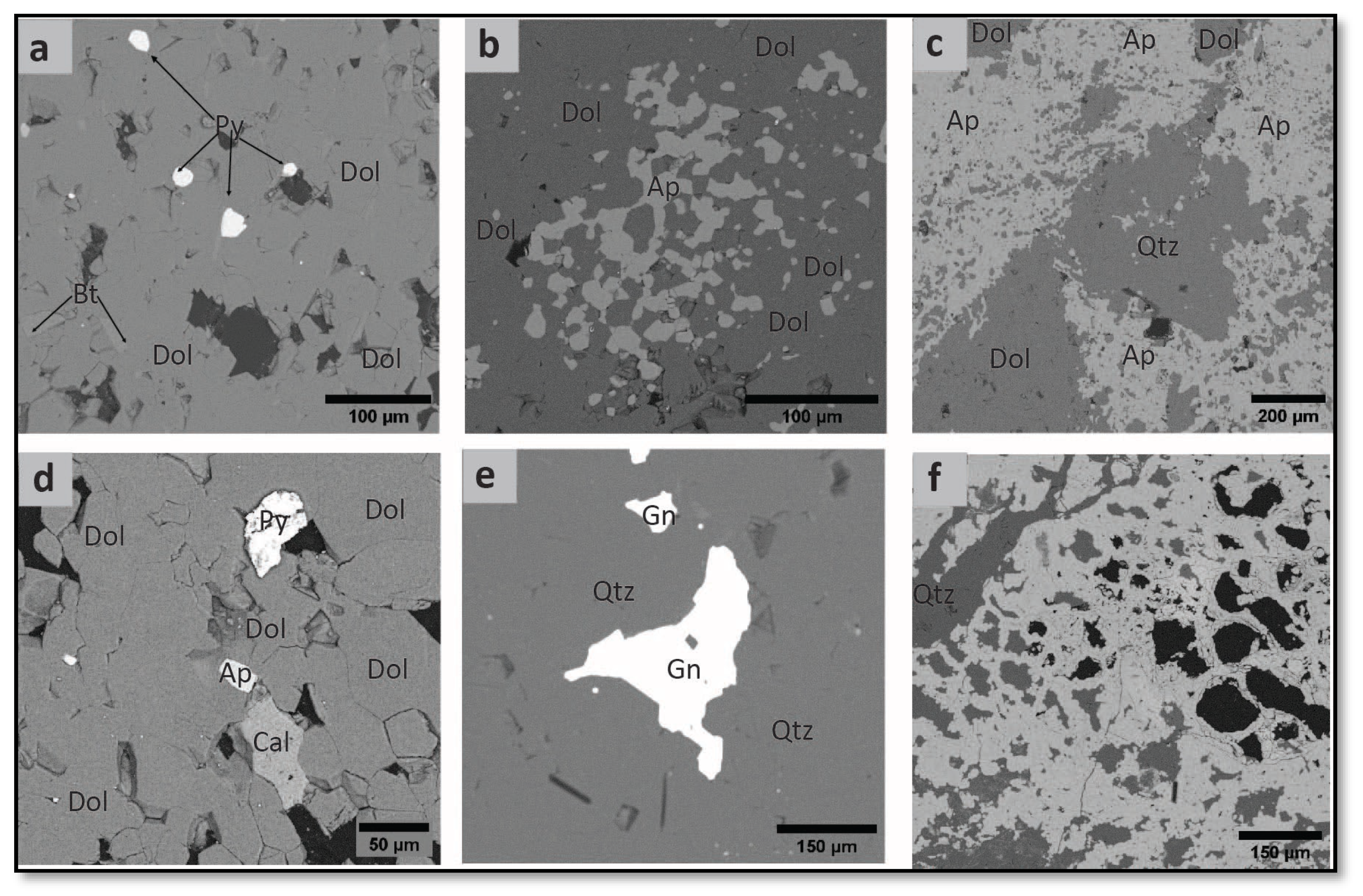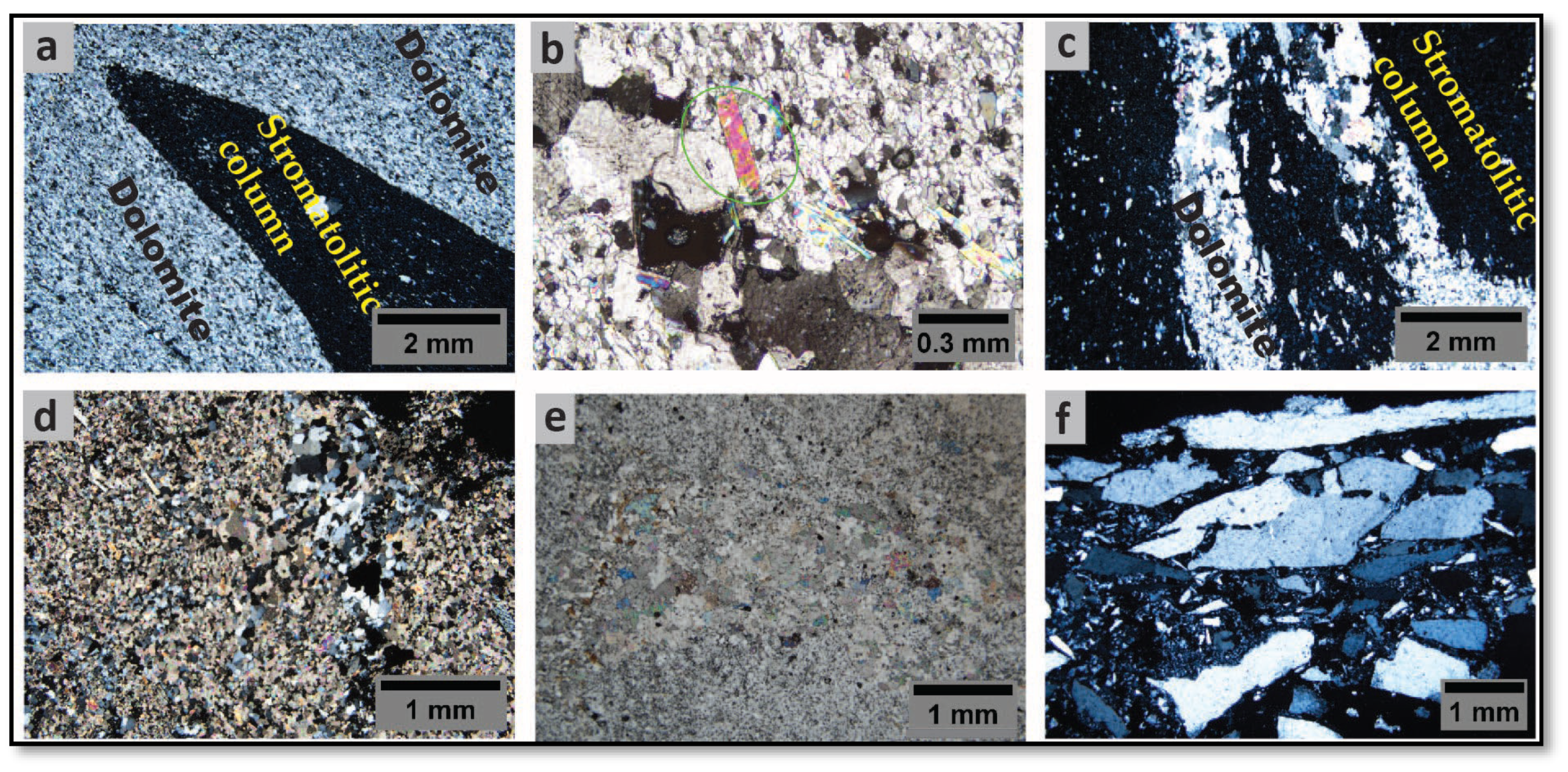Stromatolitic, phosphatic intervals consist of fluorapatite minerals and dolomite, which can be found both within and between the columns (Figure 6a,c). Accessory minerals such as quartz, mica, and sulfide are present in the phosphorite layers (Figure 7a,d,e). The western part of the mines preserves intact stromatolite columns, whereas the eastern part shows significant alteration and phosphorite enrichment. Calcite and mica grains are seen in the recrystallized E-block samples, indicating dedolomitization (Figure 7d). Conversely, B-block samples do not show any calcite grains in thin sections. Dolomite and phosphorite grains show fine, micritic texture.