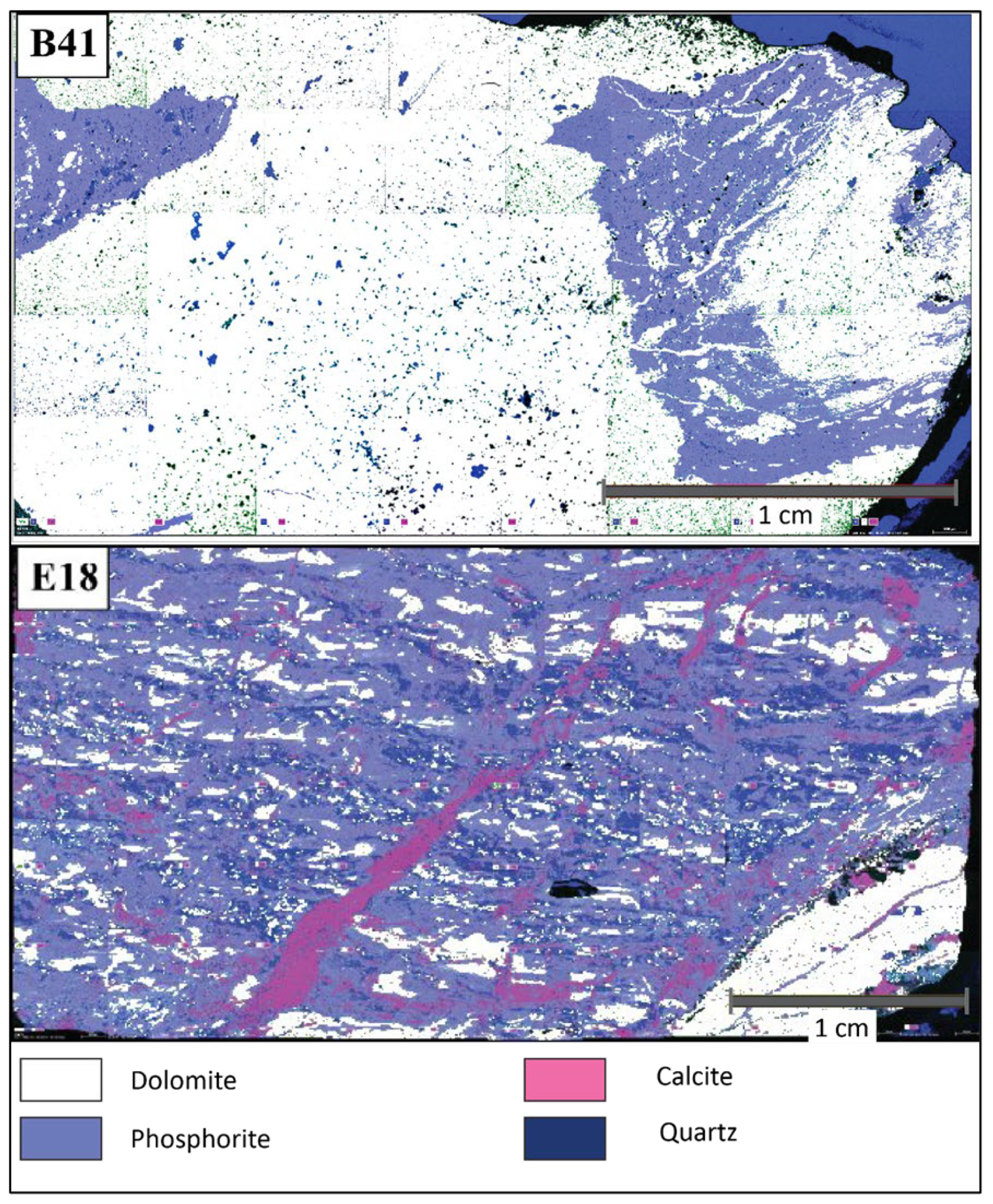 A comparative study was conducted using SEM-EDS mapping to analyze the mineral distribution in two representative thin sections, B14 and E18, of the stromatolitic and upgraded phosphorite zones in the B- and E-blocks, respectively. Multiple SEM-EDS images were captured, stacked, and processed using ImageJ software to color-code the distribution of major minerals and calculate the percentage of mineral distribution. The observations suggest that dolomite was leached out, and their modal % dropped from 69% to 19%. There is a corresponding increase in quartz concentration from 3.17 to 17.75%, fluorapatite (from 20.96 to 47.14%), and calcite (from 1.65 to 13.75%) in the E-block sample compared to the B-block sample (Figure 9; Table 1).