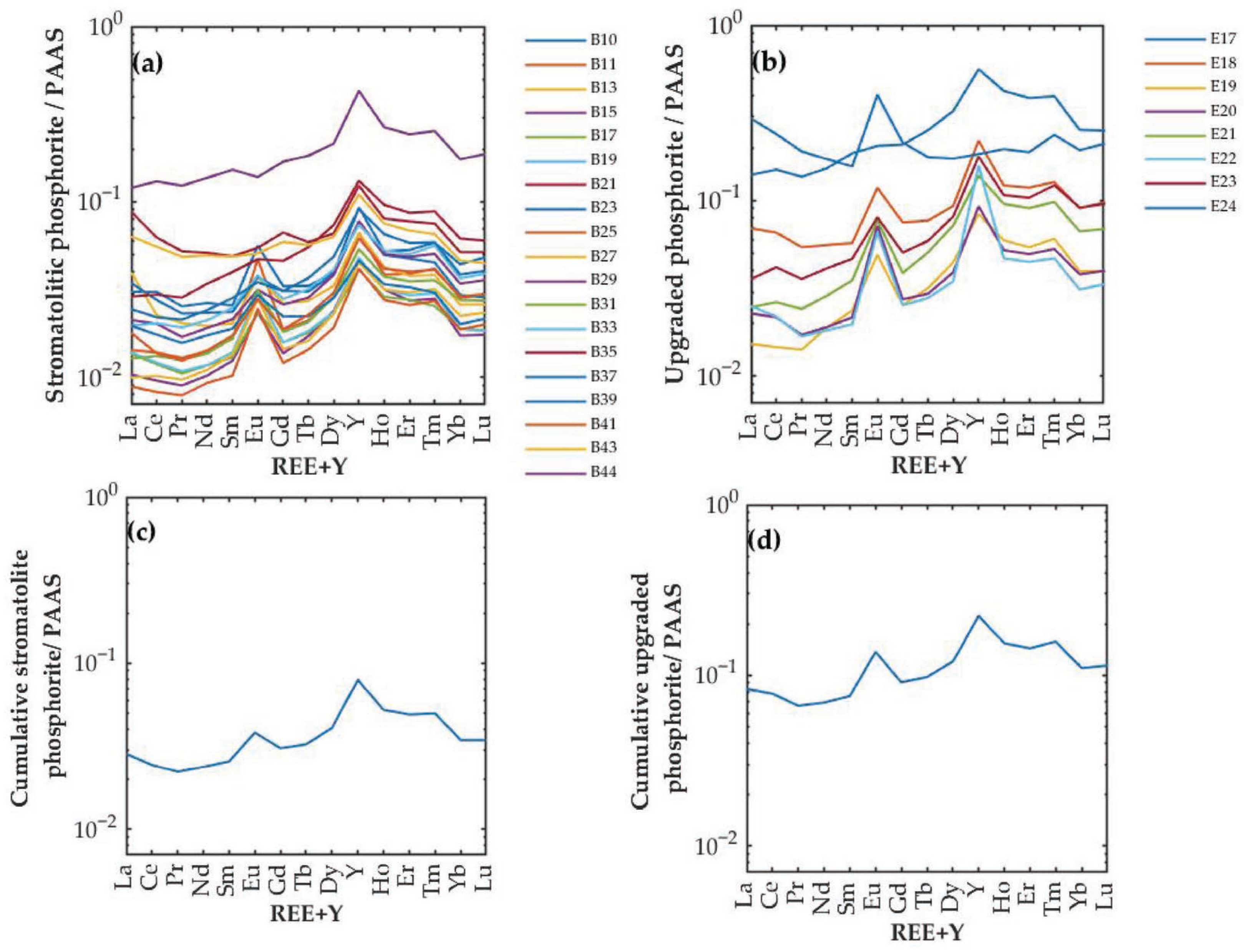 Total rare earth element ( Σ REE) concentrations in stromatolitic phosphorites range from 2.03 to 28.54 ppm (with an average of 6.22 ± 6.23 ppm). In comparison, the upgraded phosphorites have a wider concentration range of 3.86 to 38.55 ppm (with an average of 14.44 ± 13.91 ppm). In both lithologies, REE+Y, normalized to PAAS, distribution patterns are characterized by heavy REE (HREE) enrichment with respect to light REE (LREE). The REE+Y distribution patterns are similar for upgraded and stromatolitic phosphorite (Figure 13). The PAAS-normalized cumulative values indicate that the La anomaly (~1.5) remains consistent across both stromatolitic and upgraded phosphorite, showing no significant variation. In contrast, Ce exhibits a positive anomaly in all phosphorite samples, with slightly higher values in the upgraded phosphorite (1.33 ± 0.13) compared to the stromatolitic phosphorite (1.22 ± 0.08). Similarly, Eu shows a pronounced positive anomaly in all samples, being notably higher in the upgraded phosphorite (2.07 ± 0.68) than in the stromatolitic phosphorite (1.55 ± 0.45). The upgraded section also displays relative enrichment in HREEs, as reflected by a lower LREE/HREE ratio (0.53 ± 0.20) compared to the stromatolitic phosphorite (0.61 ± 0.19). In contrast, the MREE anomaly remains largely uniform between the two phosphorite types, with values around 3.30 (Table 5).