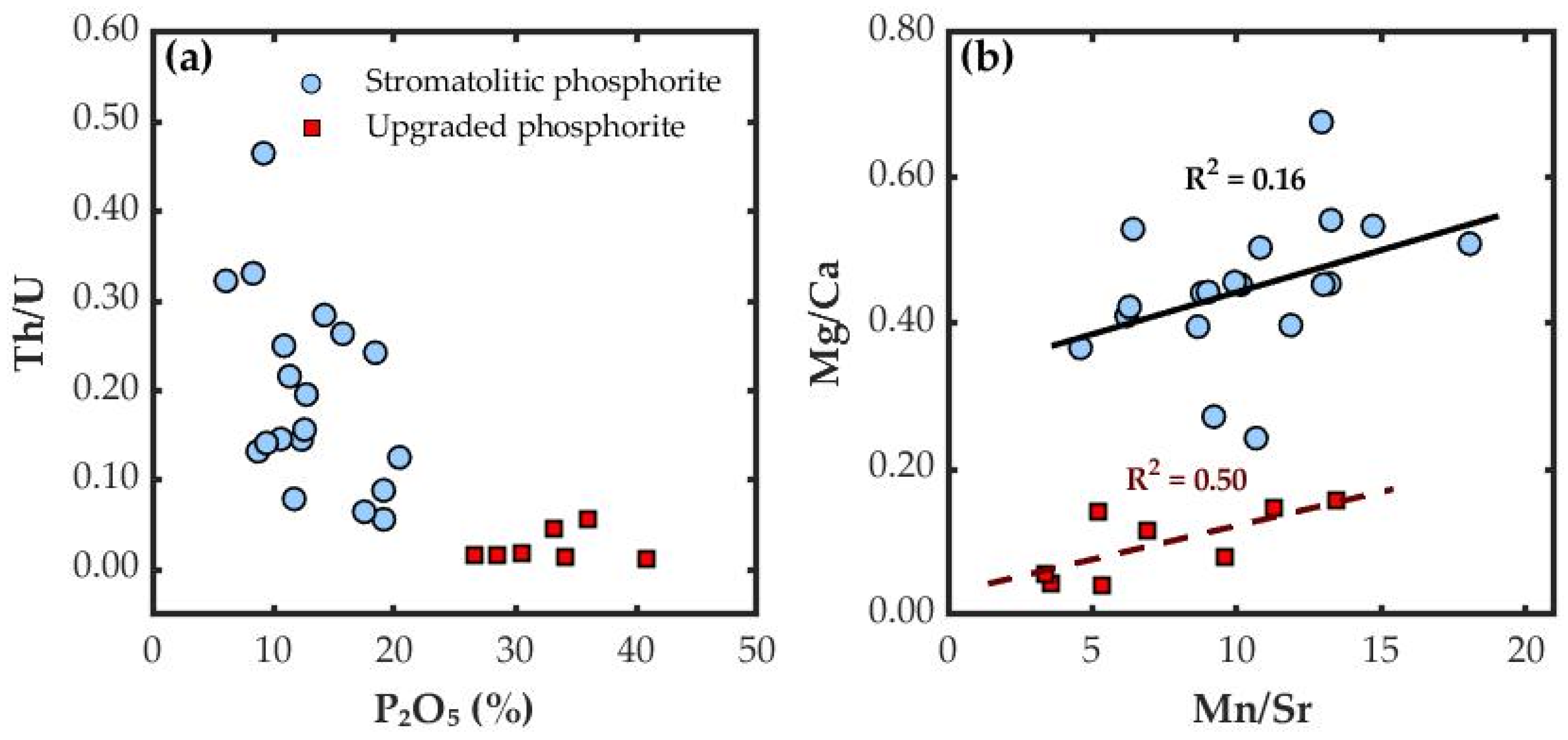 Sr and Mn enrichments in both stromatolitic and upgraded phosphorites reflect their incorporation into carbonate-fluorapatite during precipitation and early diagenesis [6,68]. The higher Sr contents, 2.23 times greater in the cumulative upgraded phosphorite than in the cumulative stromatolitic phosphorite, suggest that recrystallization, likely facilitated by hydrothermal fluid circulation, contributed to this upgrading [6,68,69,70,71]. The observed Ba enrichment, with a cumulative increase of 1.44 times in some samples, might be attributed to barite precipitation, where Ba is delivered with hydrothermal, sulfate-poor fluids and sulfate is released during phosphate recrystallization. Elevated U concentrations, up to 25 times higher in upgraded phosphorites, and low Th/U ratios indicate uranium mobility with oxidized, hydrothermal fluids. The low Th/U values also indicate uranium mobility and U delivery with oxidized hydrothermal fluids, followed by its subsequent incorporation into apatite upon reduction. Structurally controlled fluid pathways were likely crucial for this process. The relatively uniform PAAS-normalized patterns for lithophile elements such as Sc, Zr, and Th across both phosphorite types suggest minimal detrital influence [68].