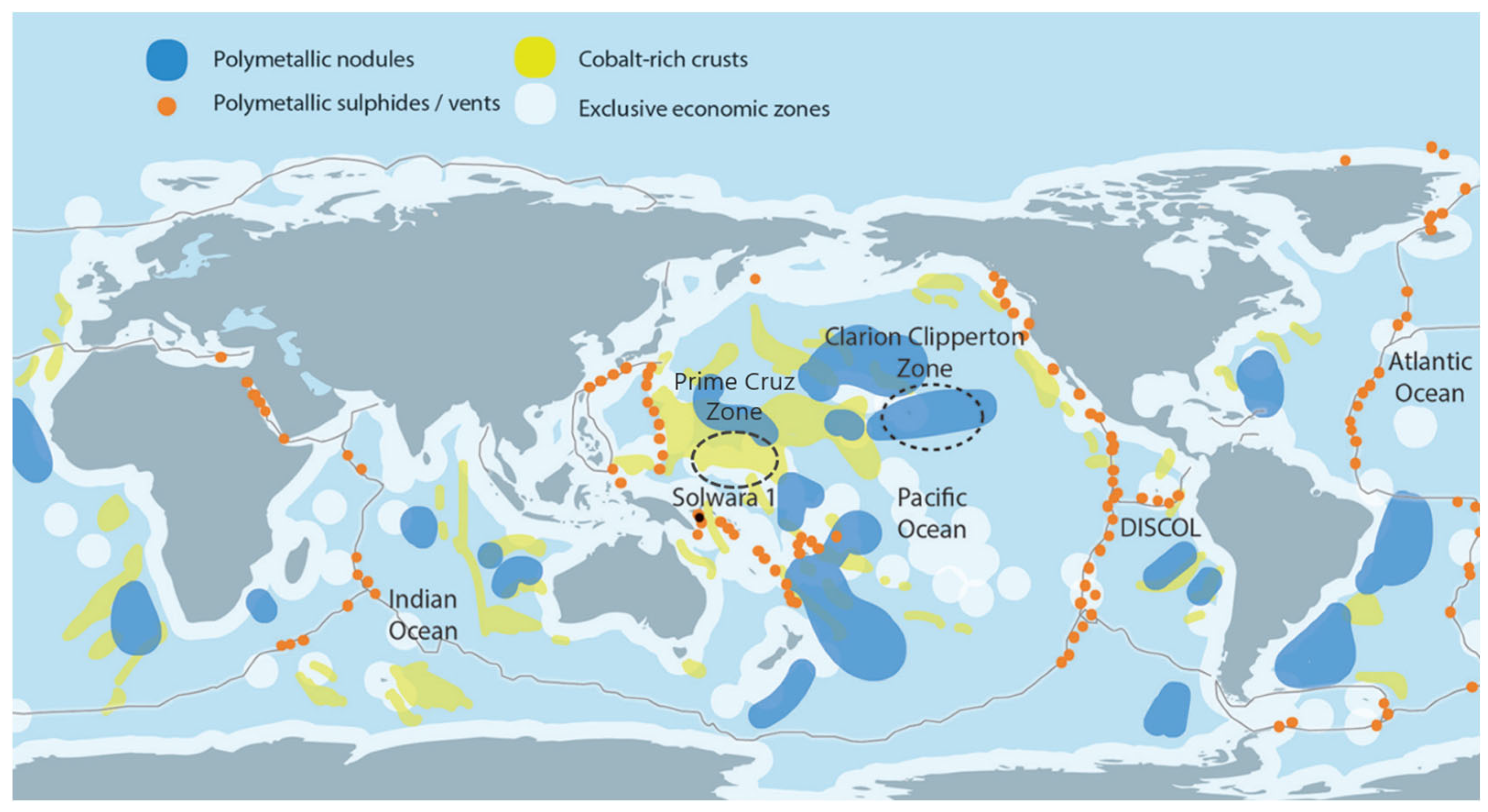 This interest is not driven by a single deposit but by a broad geographic distribution at a global oceanic scale, spanning mineralized zones across different oceans and under different jurisdictional regimes.