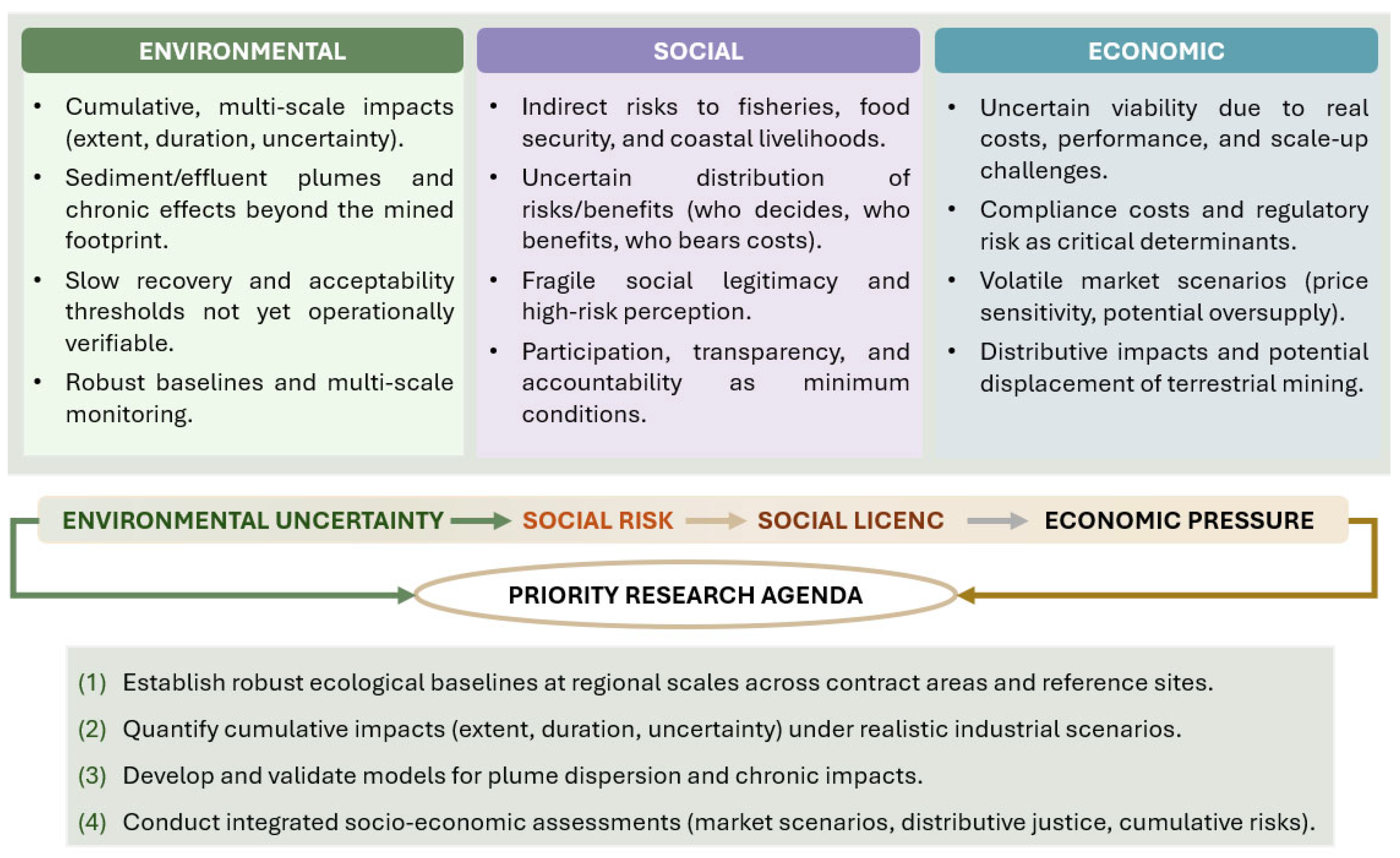 In this context, while access to natural resources in the deep ocean represents a strategic opportunity in both financial terms and supply security, it also raises substantial challenges for achieving sustainability objectives. Key concerns relate to uncertainty regarding DSM’s potential risks to marine ecosystems and its possible social and economic effects. The literature shows recent progress; however, evidence remains nascent or fragmented in several critical areas, particularly with respect to cumulative impacts, spatial and temporal scaling, and long-term socio-economic assessments, supporting the need for broader, more structured analyses that integrate the available evidence on the impacts and opportunities associated with these activities.