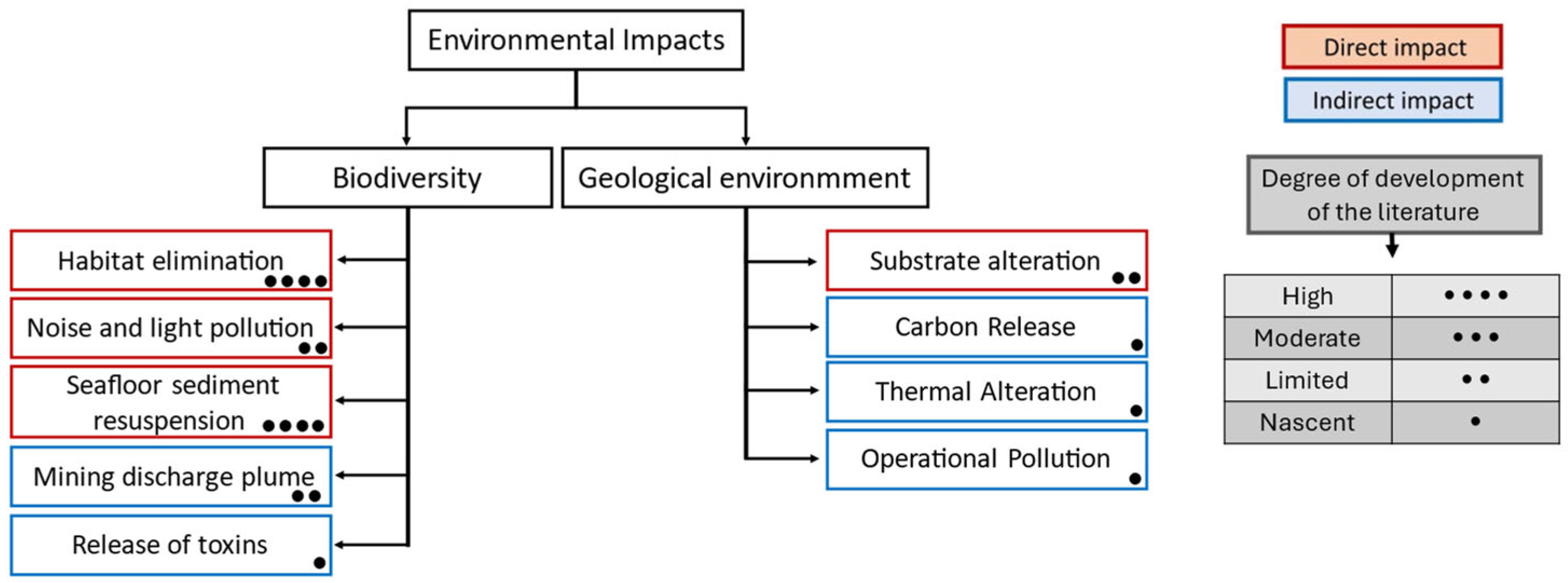 27]. Based on the literature review conducted in this study, the main environmental impacts can be identified and organized into two broad groups: those that directly affect biodiversity and those that compromise the geological environment of the seafloor, as illustrated in