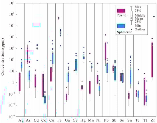 Box-and-whisker plots showing trace elements of main-ore-stage sphalerite and pyrite from the Maoping Pb–Zn deposit.