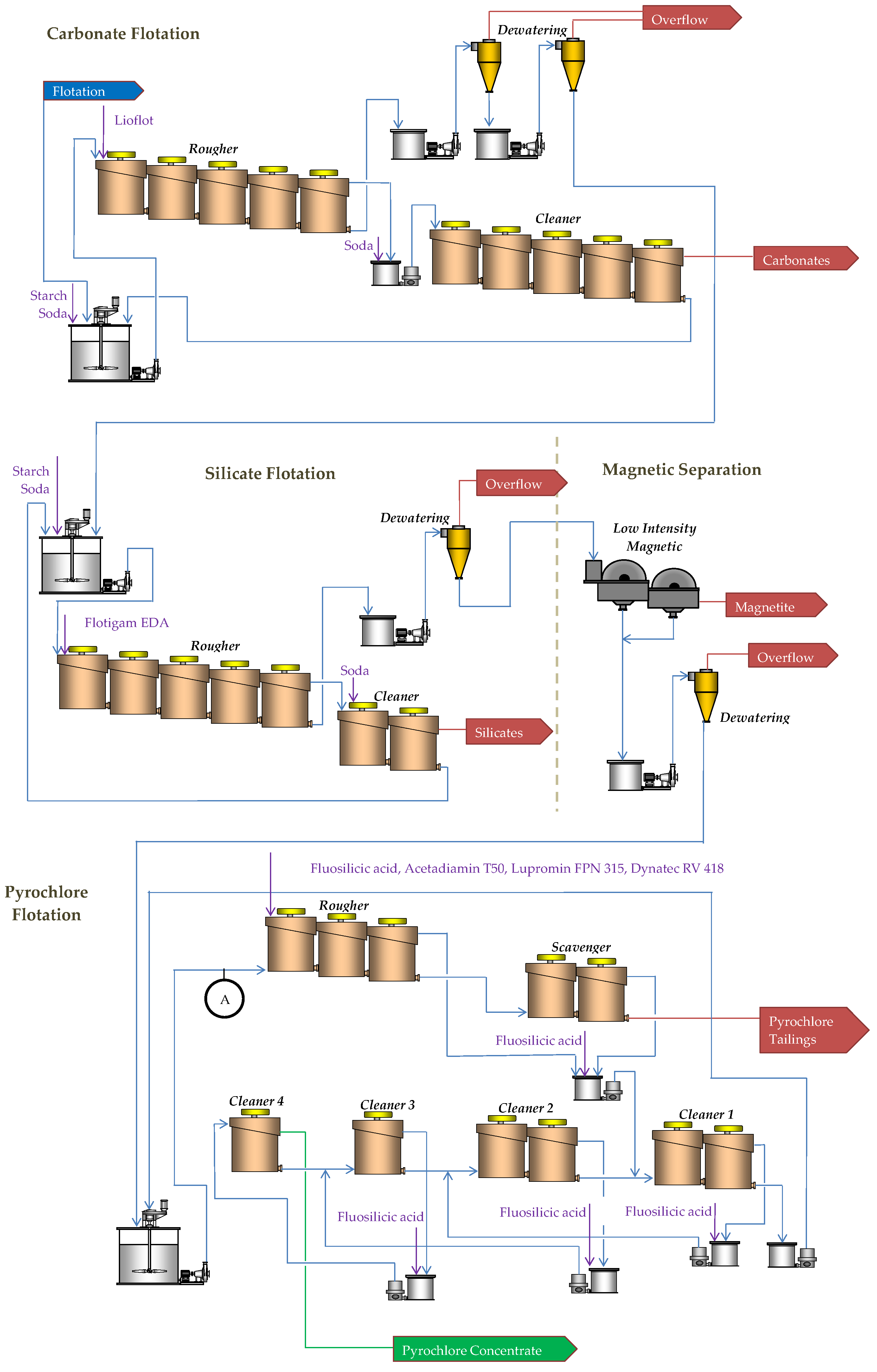 - Gouvea Junior, J.T.; Morais, V.J.; Leal Filho, L.S. Decrease of Pyrochlore Loss to the Tailings Pond by Improving Current Flotation Process—Final Report; Technical Report, Grant 600212, agreement; CMOC/Embrapii/USP: São Paulo, Brazil, 2025. [Google Scholar]