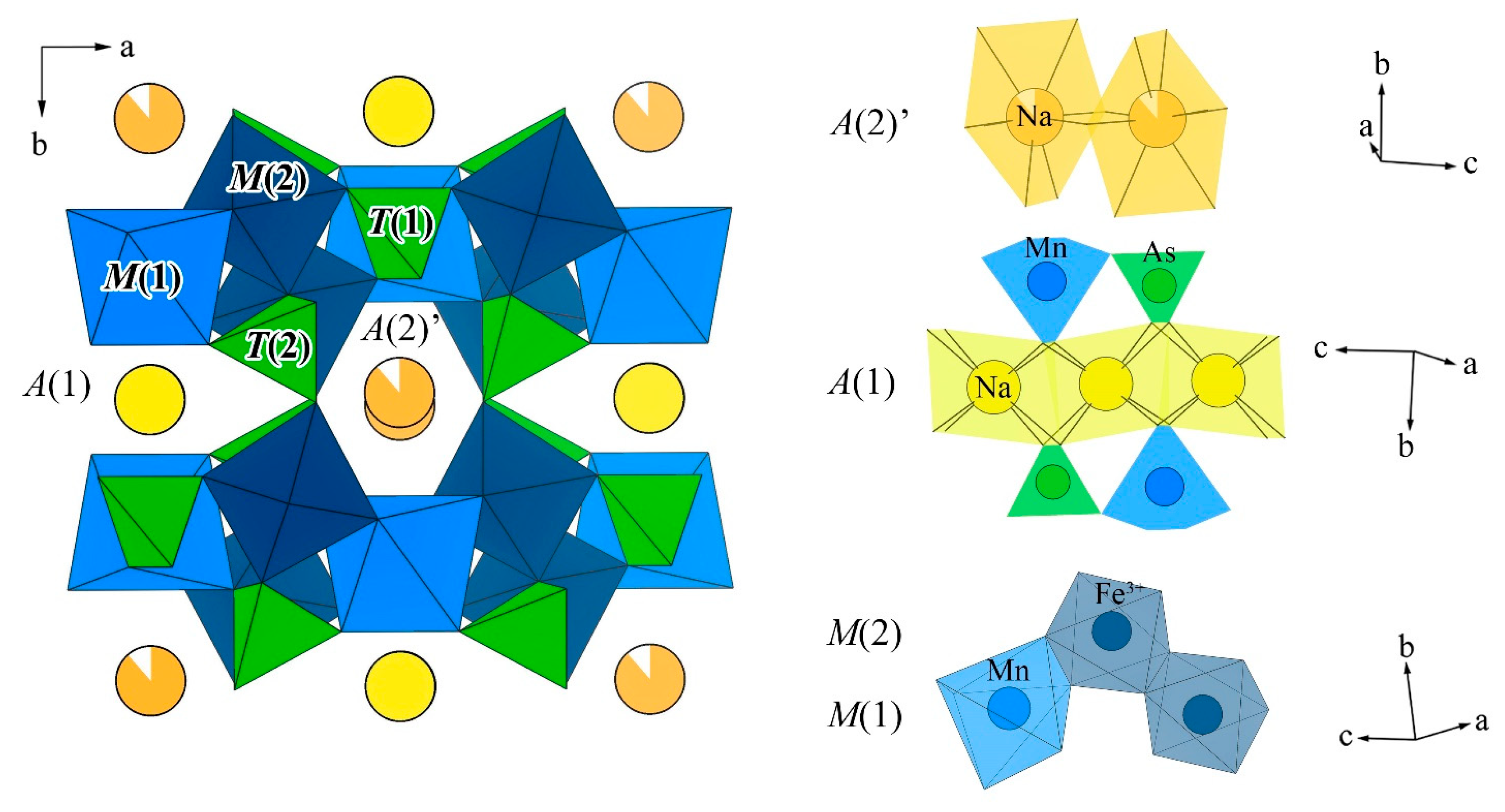 In the structure of manganobadalovite (Figure 3), both A(1) and A(2)’ sites are predominantly occupied by Na; the average A(1)–O distance is 2.434 Å and that of A(2)’–O is 2.729 Å. None of other A sites in the channels are filled. The M(1) site is occupied by Mn2+ with admixtures of Ca, Mg and Na; the average M(1)–O distance is 2.239 Å. The M(2) site is occupied by Fe3+, Mg and subordinate Mn; the average M(2)–O distance is 2.049 Å. Both tetrahedral sites are occupied by As5+ with similar average T–O distances of 1.683 Å.