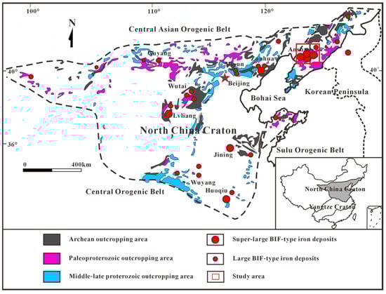 A geological map showing the distribution of Precambrian BIF-type iron deposits in the North China Craton (modified from Jia et al., 2026) [12].