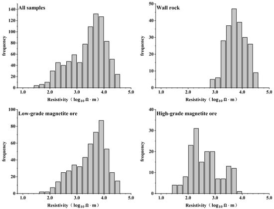 The statistical analysis of resistivity is summarized in Table 3 and illustrated in Figure 7. The overall resistivity of the rocks and ores ranges from 34 to 67,187 Ω·m, primarily concentrated between 200 and 15,000 Ω·m. The wall rocks exhibit the highest resistivity, with an average value of 8351.42 Ω·m, mainly varying between 2000 and 25,000 Ω·m. The resistivity of low-grade magnetite ore is slightly lower, averaging 6153.00 Ω·m and distributed mostly between 500 and 20,000 Ω·m, which aligns closely with the overall distribution. In contrast, high-grade magnetite ore shows the lowest resistivity, averaging 1041.31 Ω·m and ranging predominantly from 100 to 10,000 Ω·m. The results indicate that the Fe content of the rocks and ores influences their resistivity, with a particularly significant contrast observed between high-grade magnetite ore and other rock types.