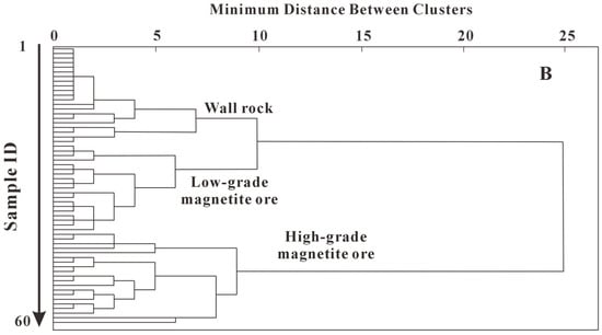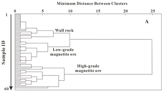 Due to significant differences among the rock and ore samples, stratified sampling was conducted for statistical analysis. Twenty samples each were selected from low-grade magnetite ore, high-grade magnetite ore, and wall rock, resulting in a total of 60 samples. Sample numbers 1–20 represent wall rock, 21–40 represent low-grade magnetite ore, and 41–60 represent high-grade magnetite ore. Cluster analysis was first performed based on density and magnetic susceptibility parameters. The results, shown in Figure 9A, indicate that all 20 wall rock samples were accurately classified into a distinct group. Among the iron ore samples, six were misclassified, yielding an overall classification accuracy of 90.0%. Subsequently, resistivity was included as an additional variable in the cluster analysis. The results, presented in Figure 9B, show that all 20 wall rock samples were again correctly classified. Among the iron ore samples, only 2 were misclassified, increasing the overall accuracy to 96.7%. Repeated stratified sampling and cluster analysis consistently yielded results consistent with these findings. The results of Q-mode cluster analysis indicate that density and magnetic susceptibility parameters exhibit good sensitivity in distinguishing wall rock from low-grade and high-grade magnetite ores in the Gongchangling mining area. The discrimination accuracy between low-grade and high-grade ores is further improved after incorporating resistivity parameters, which aligns with the findings from the correlation analysis.