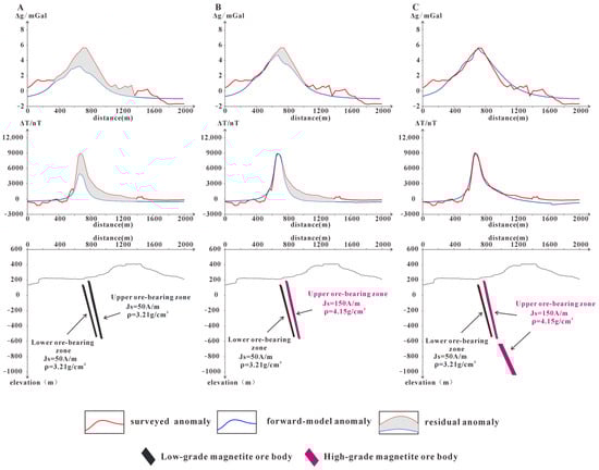 High-precision gravity and magnetic survey profiles were laid out from Duimiangou to Yanjiapu in the Gongchangling area, traversing the mining area II of the Gongchangling deposit. The measured gravity and magnetic anomaly curves are shown in Figure 10. The gravity anomaly curve exhibits a shape similar to that of the magnetic anomaly curve, demonstrating the characteristic “coincident high gravity and magnetic anomalies” indicative of the Gongchangling-type high-grade magnetite ore bodies. The forward modeling results of the gravity magnetic profiles indicate that a single low-grade ore body cannot produce the measured intensity of gravity and magnetic anomalies, with both showing high residual anomaly values. When geological constraints reflecting the occurrence of high-grade ore bodies are applied, the forward modeled anomalies show good agreement with the measured anomalies, although broad and gentle residual gravity and magnetic anomalies persist on the left side of the profile. Figure 10C suggests that a thick high-grade magnetite orebody is likely hosted at depths below −600 m elevation, allowing the forward modeled anomalies to closely match the measured anomaly intensities.