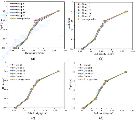 The relationship curve between the bulk density and depth of tailings sand on site. (a) Hole 1–position 1; (b) Hole 1–position 2; (c) Hole 2–position 1; (d) Hole 2–position 2.