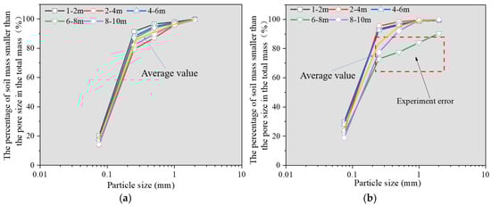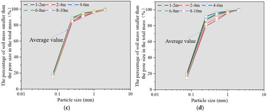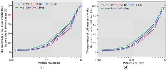 A further comparison of Figure 8a,b reveals that within the depth range of 0–6 m, the particle-size distributions of the two sample sets are relatively similar. Below 6 m to 10 m, however, the particle composition varies noticeably with depth. Overall, except for the second sample set at 6–8 m depth, the fraction of particles smaller than 2 mm in all other samples remains around 98%, indicating that the tailings sand is primarily composed of fine to medium-coarse sand, with a relatively uniform and concentrated gradation.
