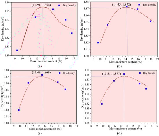 Compaction test curve. (a) Group 1; (b) Group 2; (c) Group 3; (d) Group 4.