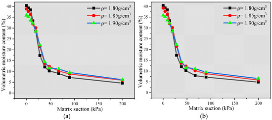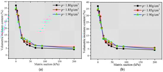 The influence of different dry densities of silt on the soil-water characteristic curve. (a) Group 1; (b) Group 2.