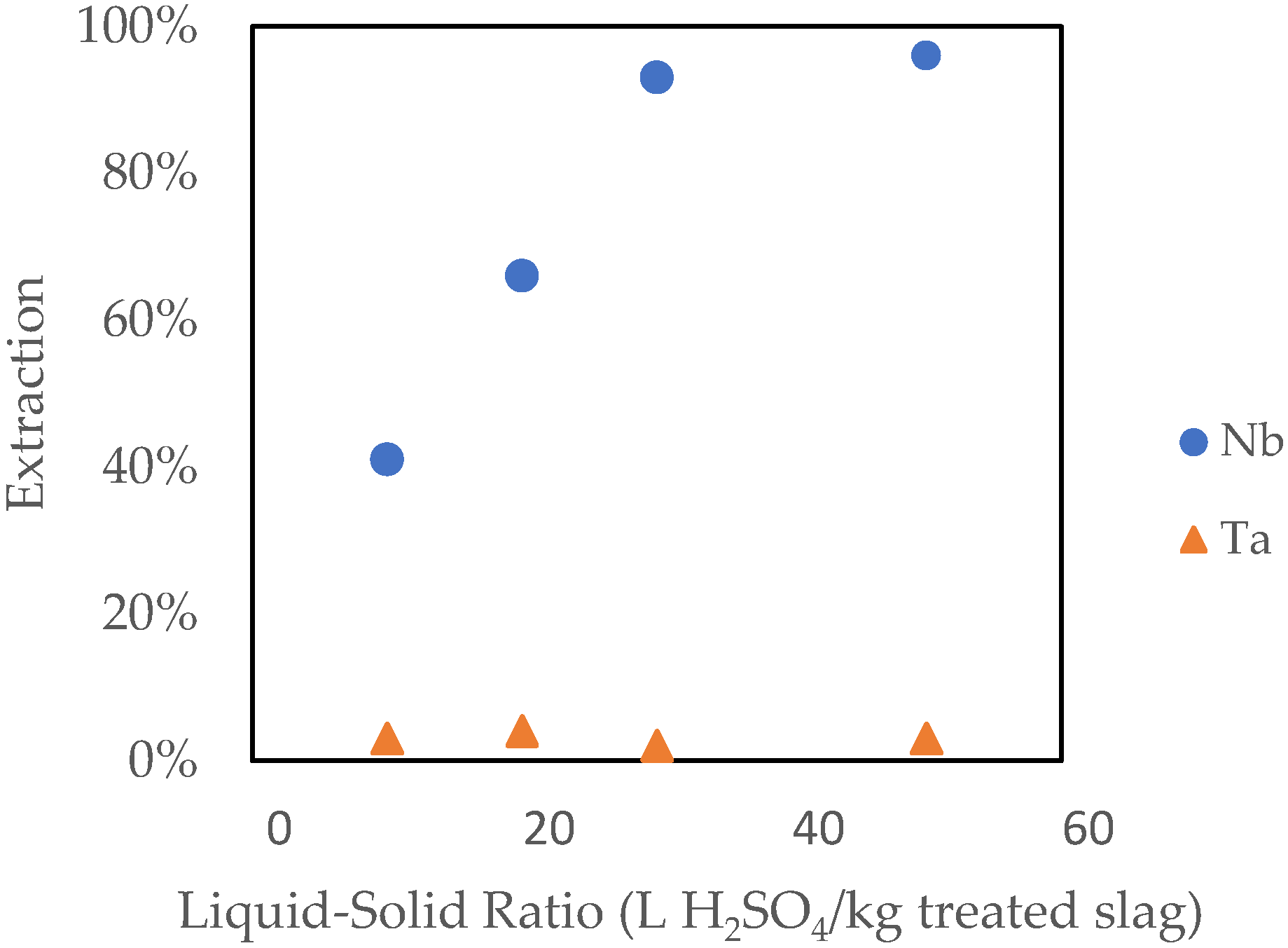 | Direct leaching with fluoride salt (NH4F-HCl) | Direct leaching of the ground slag using a mixture of HCl and NH4F to generate HF in situ for the complexation of Nb and Ta | Leaching: 100% Nb 5% Ta | [13] |