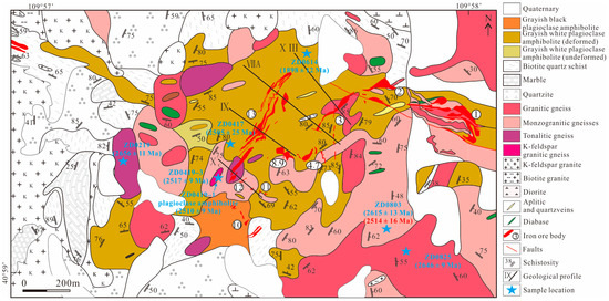 As aforementioned, the NCC was subjected to extensive metamorphic–magmatic events (i.e., cratonization) at the end of the Neoarchean (~2.51–2.45 Ga, refs. [4,5,6]). Although this may have helped to explain the absence of late Mesoarchean to early Neoarchean BIFs as these sediments and their associated rocks might have been significantly altered during the multi-stage tectono-thermal event, more works with respect to the depositional ages of BIFs in the NCC are still warranted. To address these challenges, we conducted geological and geochronological studies on the Gongyiming BIF of Guyang Greenstone Belt (GGB), NCC. This was coupled with systematic macro- and microstructural characteristics of the BIF and its associated rocks. Notably, this BIF has suffered intense deformation and been separated into different blocks by plutonic intrusions of various ages, making it a typical example of its Archean counterparts in the NCC. For this study, we interpret the depositional age of the Gongyiming BIF according to our new field observations and zircon U-Pb age dating, before assessing its tectonic deformation processes. By doing so, an early Neoarchean formation age and a structurally controlled exploration model were established for this BIF.