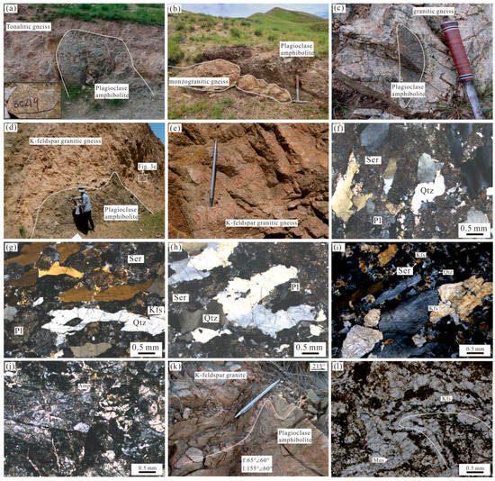 The potassium feldspar granitic gneiss (sample ZD0419-3) has an intrusive relationship to the plagioclase amphibolite (Figure 4d). It exhibits a granitic texture and gneissic structure (Figure 4e) and is composed of potassium feldspar (40%–50%), plagioclase (20%–30%), and subordinate quartz (10%–15%) (Figure 4i). The potassium feldspar is granular in shape and displays distinct tartan twinning. Moreover, this mineral is weakly oriented and has undergone argillic alteration on its surface. By compression, quartz shows a wavy extinction characteristic and occurs in irregular shapes, while plagioclase is present in lesser amounts and has undergone intense sericitization.