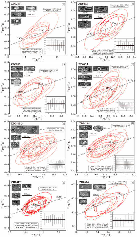 Zircon U-Pb concordia diagrams of the tonalitic gneiss ((a), sample ZD0219), monzogranitic gneiss ((b,c), sample ZD0803), granitic gneiss ((d), sample ZD0825), potassium feldspar granitic gneiss ((e), sample ZD0419-3), plagioclase amphibolite xenolith ((f), sample ZD0419-1), banded plagioclase amphibolite ((g), sample ZD0417) and potassium feldspar granite ((h), sample ZD0614) from the Gongyiming BIF-type iron deposit.